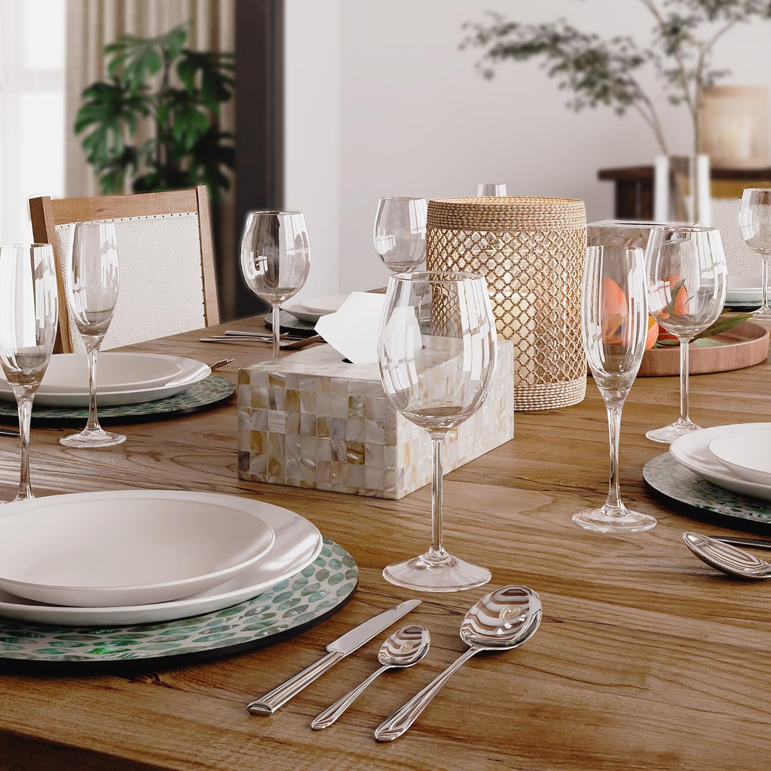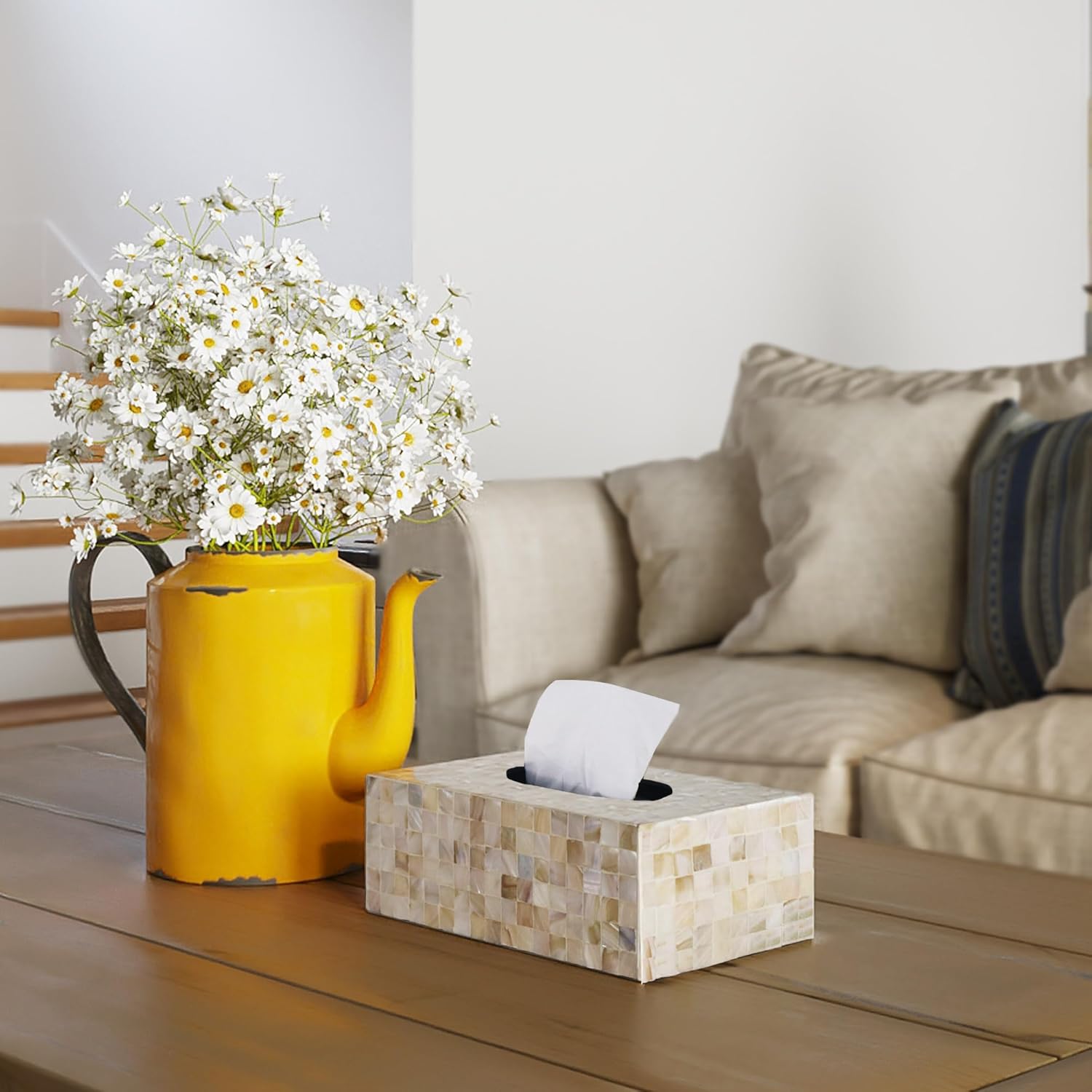 - [UNIQUE GIFT] This rectangular tissue box cover holder with moth or pearl / capiz shell inlay is a perfect present for Holiday Season, New Year, Christmas Eve, Celebrations for natural lovers and minimalists, an ideal gift to express love and gratitude in special events. The mother of pearl decorative tissue box holder is a great rustic boho farmhouse centerpiece to any table, kitchen, party, coffee bar desk, dining room, bathroom, home, or restaurant.
