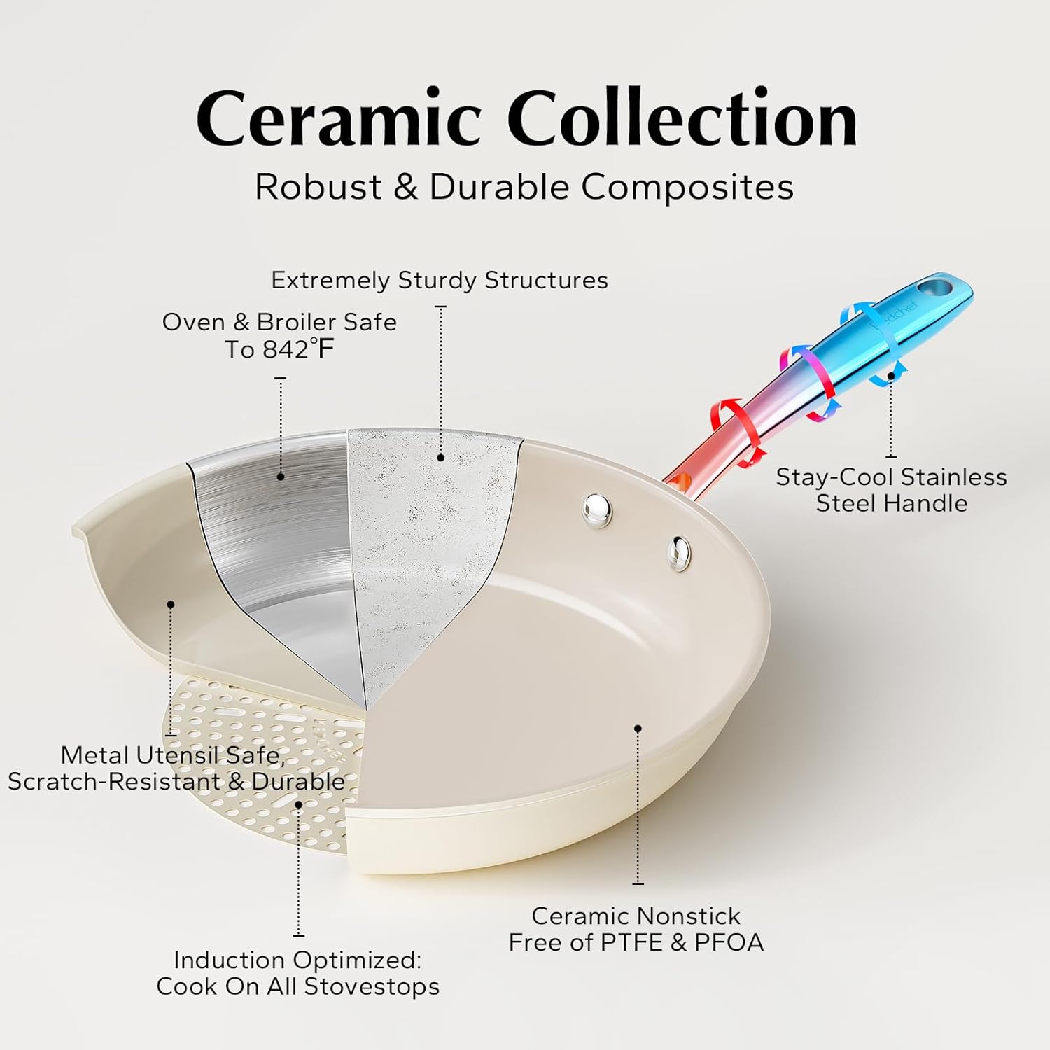 - COOL & STURDY HANDLE: Crafted from lightweight, precision-pressed stainless steel, this ergonomically designed handle ensures a comfortable grip. Double-riveted for exceptional strength and maneuverability, the ceramic skillet pan empowers you to seamlessly transition from stovetop to oven, allowing you to achieve that flawless sear, brown toppings, or even bake