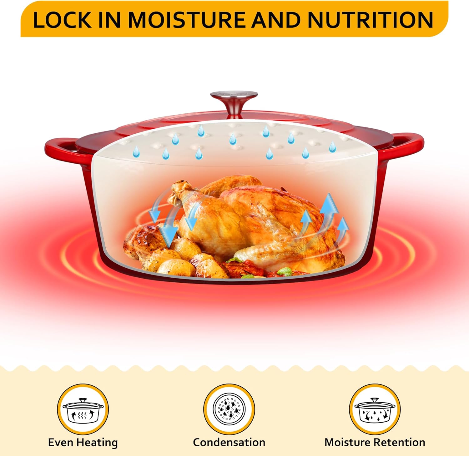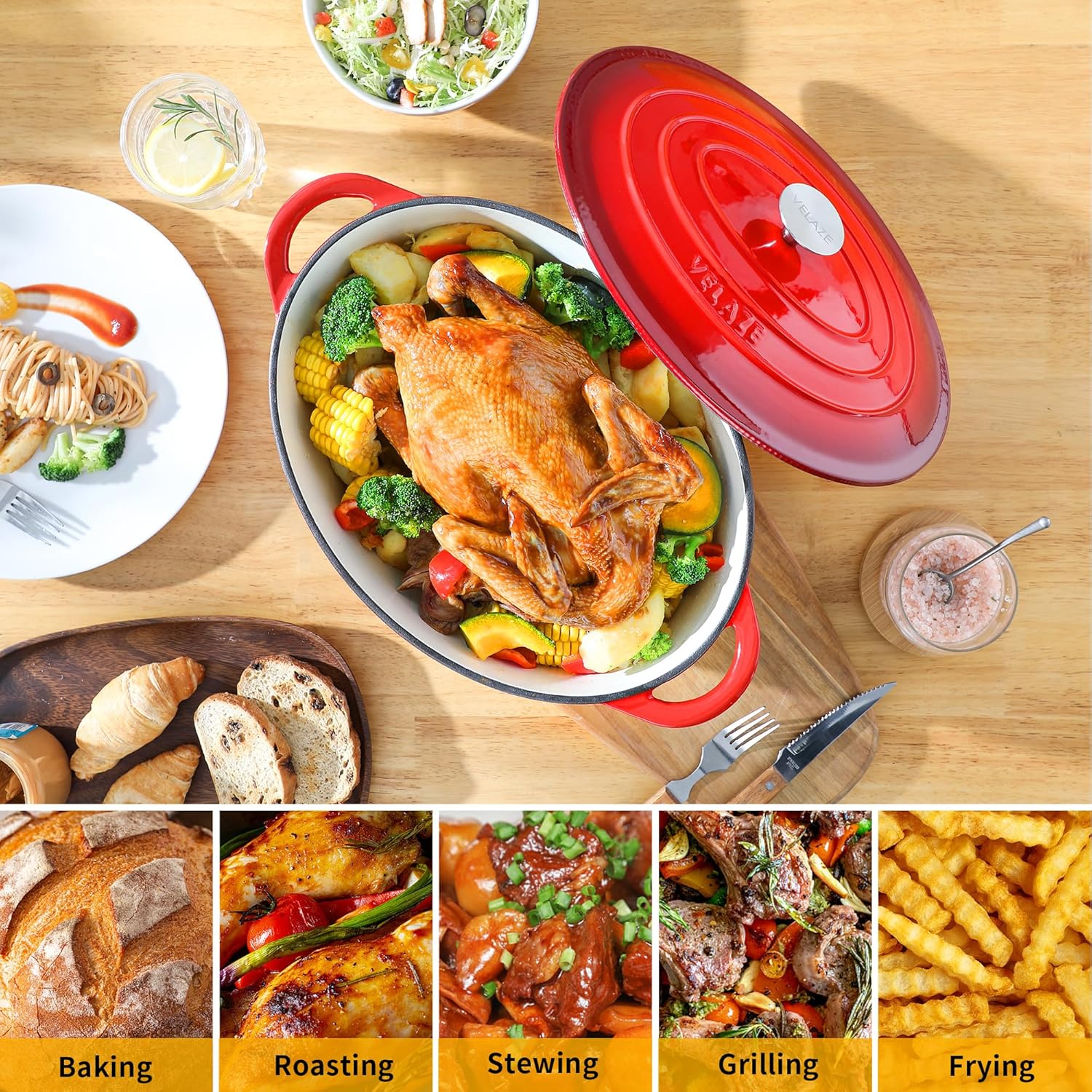 Velaze 7.5 QT Enameled Oval Dutch Oven Pot with Lid, Cast Iron Dutch Oven with Dual Handles for Bread Baking, Cooking, Frying, Non-stick Enamel Coated Cookware (RED)