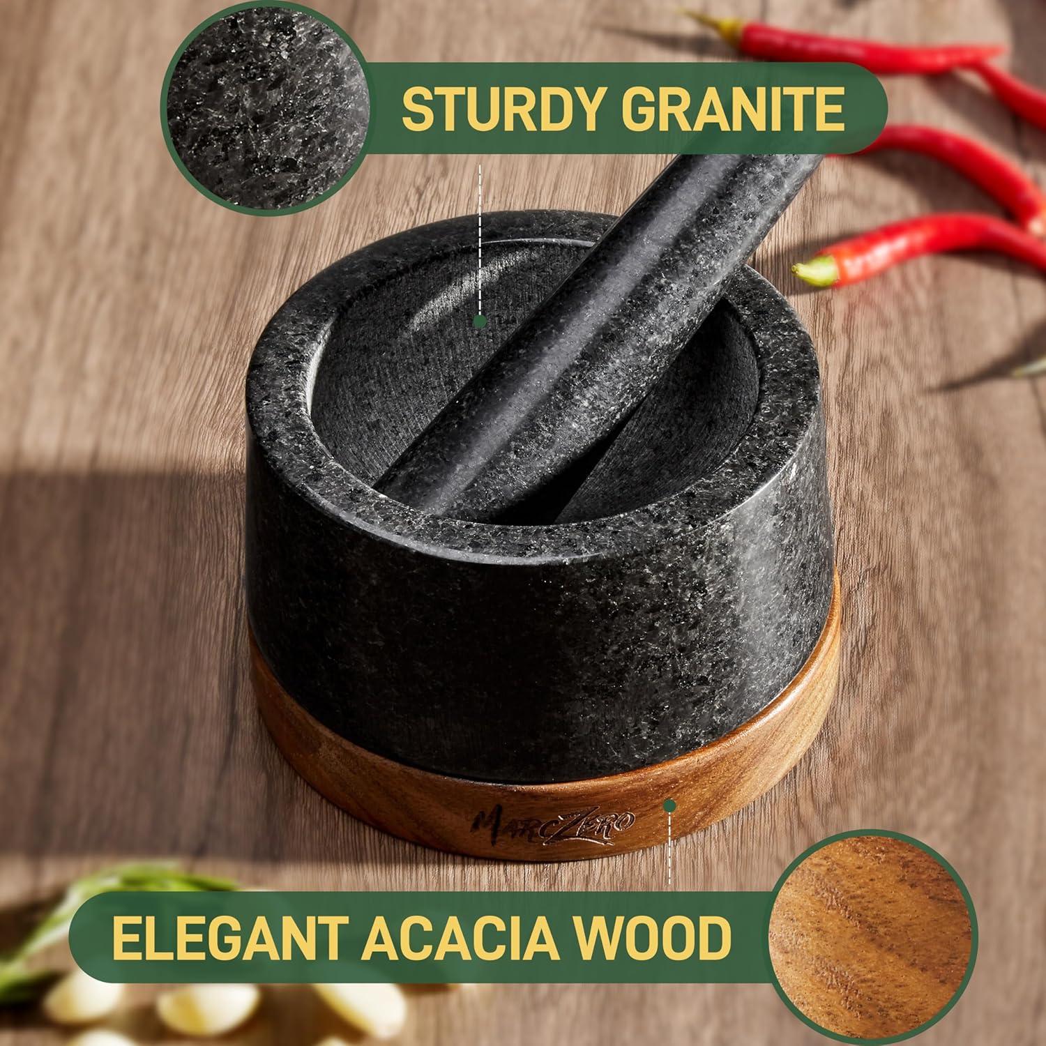 MarcZero 6inch Large Mortar and Pestle Set with Anti-Scratch Wooden Base,Heavy Duty Mortar and Pestle Made of Natural Granite(Black)