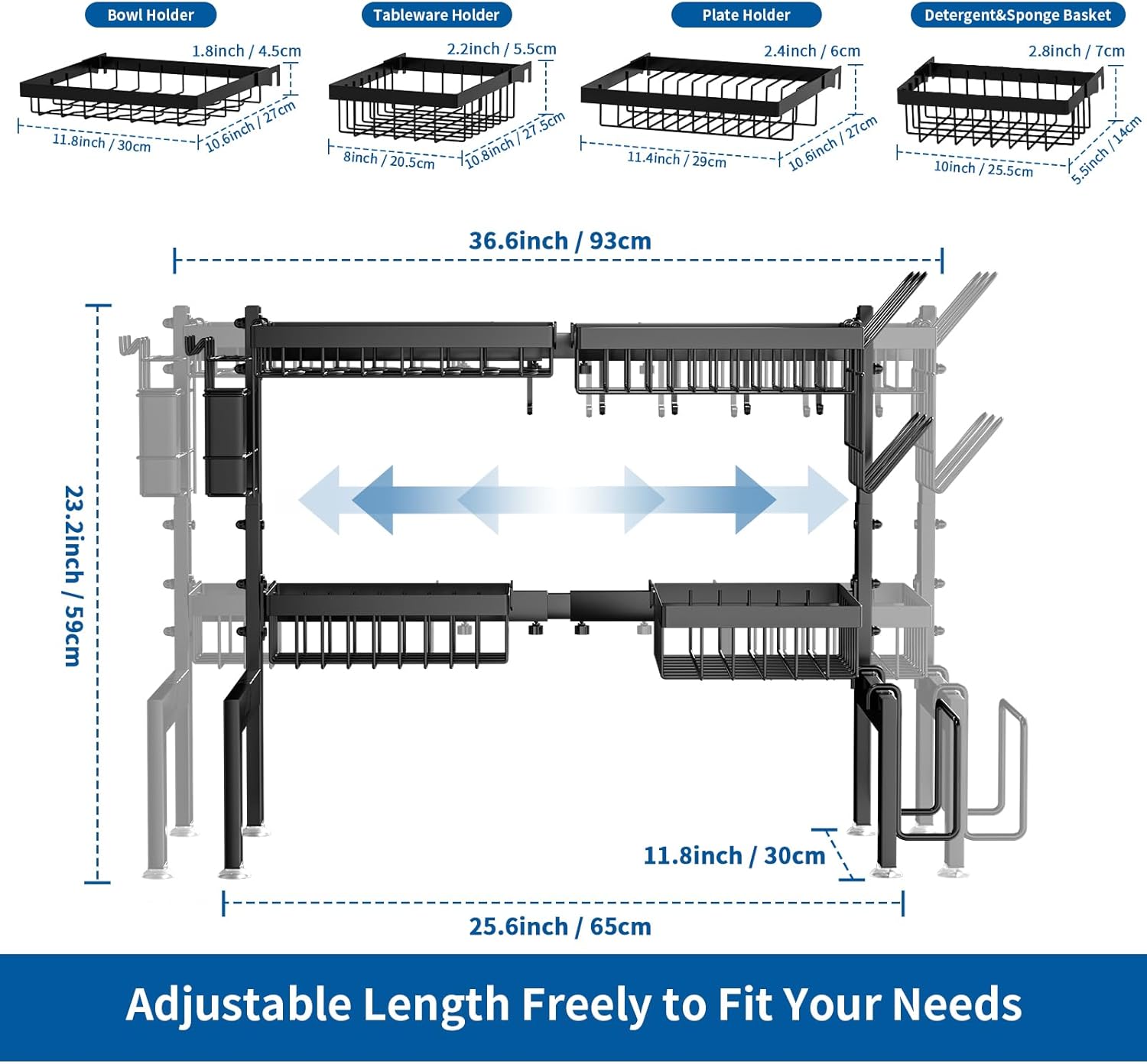 - Fit Most Sinks:This over the sink drying rack length can be adjusted from 25.6'' to 36.6'' according to your needs. it's dimension as follow:L*W*H: 25.6~36.6x 11.8 x 23.2 inch. (not count the height of the dish and bowl).