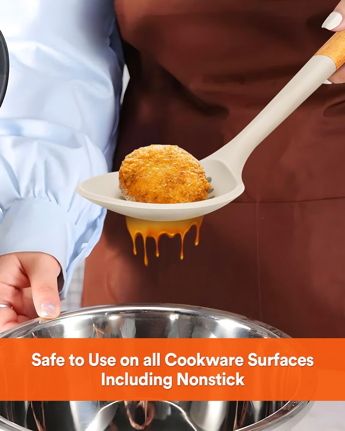 - The Most Thoughtful Design: The high-quality nylon core is more durable and keeps you away from the trouble of kitchen utensils rusting or breaking. The anti-scald Wooden handle is not easy to conduct heat and is more comfortable to hold than traditional utensils