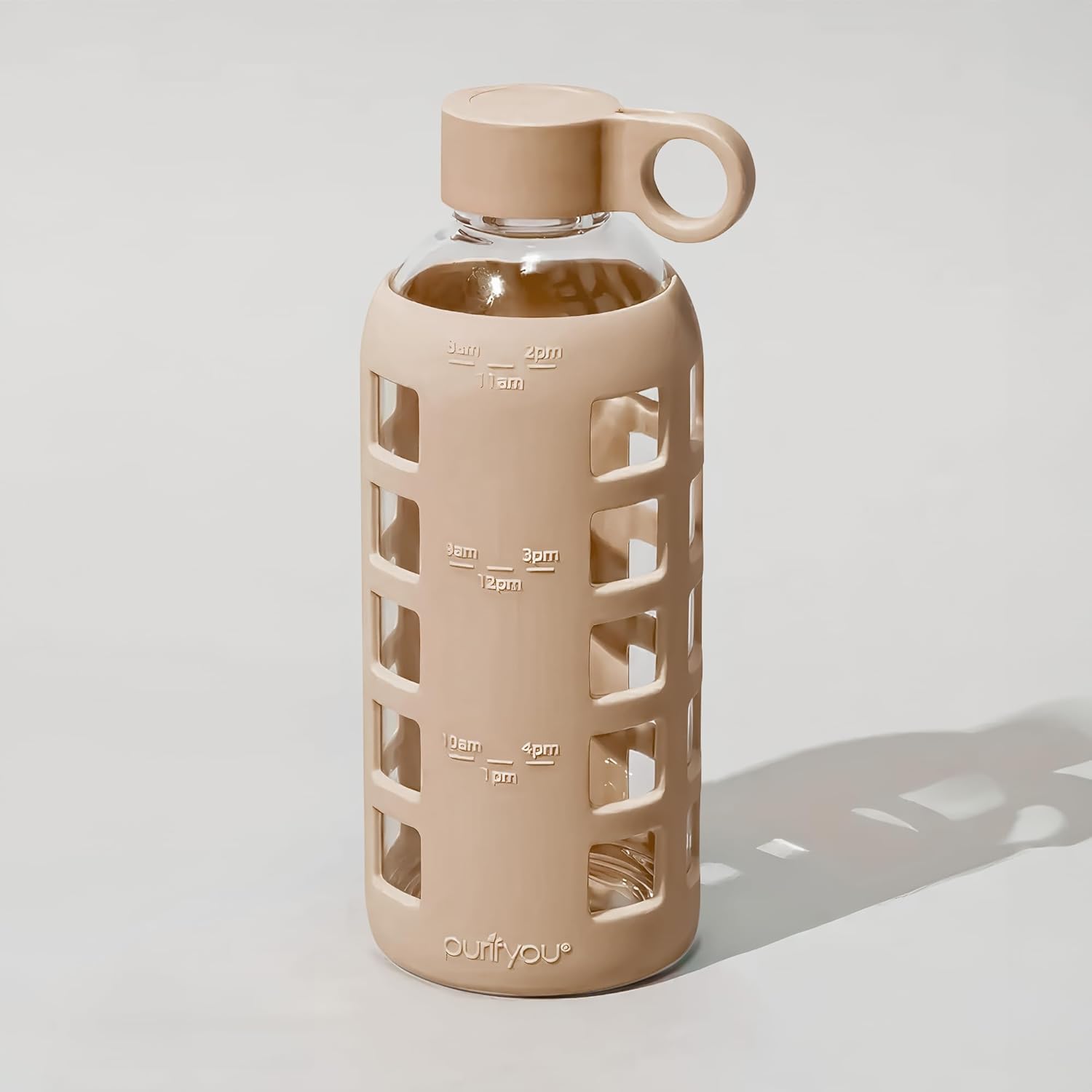 purifyou 40oz / 32oz / 22oz / 12oz Borosilicate Glass Water Bottle with Time & Volume Markers, Silicone Sleeve, Stainless Steel Lid – Reusable Glass Bottle for Water & Juice (22oz Iced Coffee)