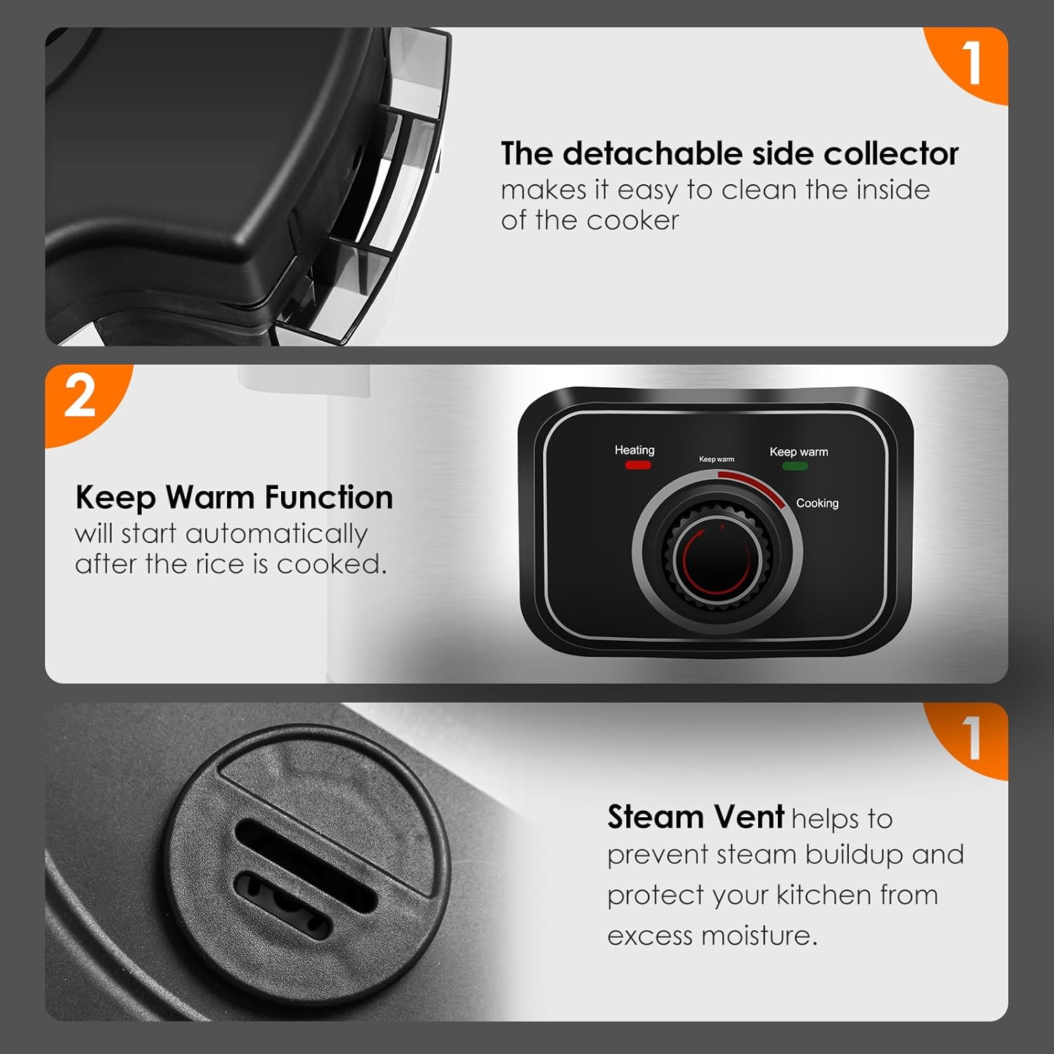 - 【Commercial-Grade Durability】 Crafted from high-quality, robust materials, our rice cooker is built to withstand the rigors of a commercial kitchen environment. The stainless steel exterior construction ensures longevity and easy cleaning, while the non-stick inner pot simplifies maintenance.