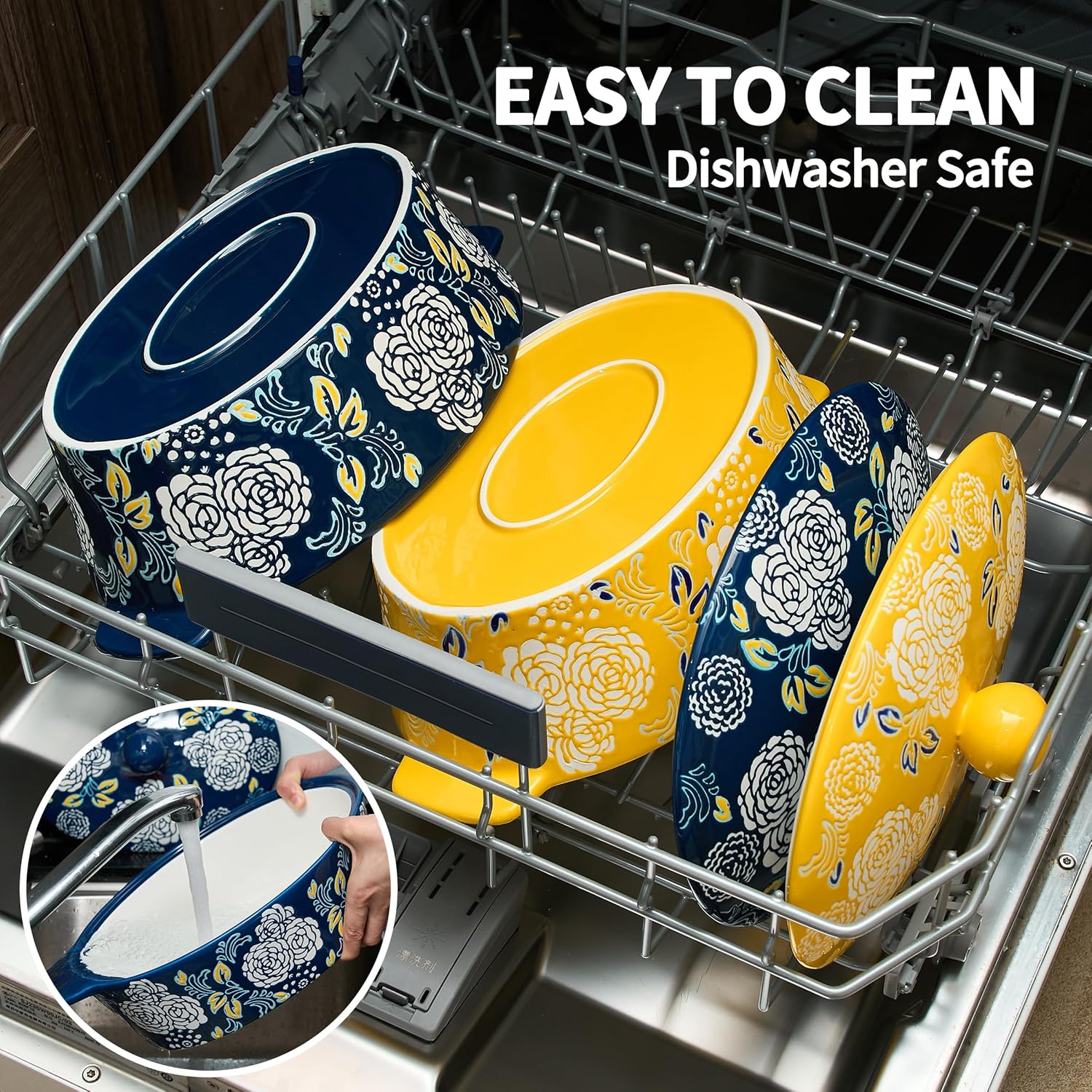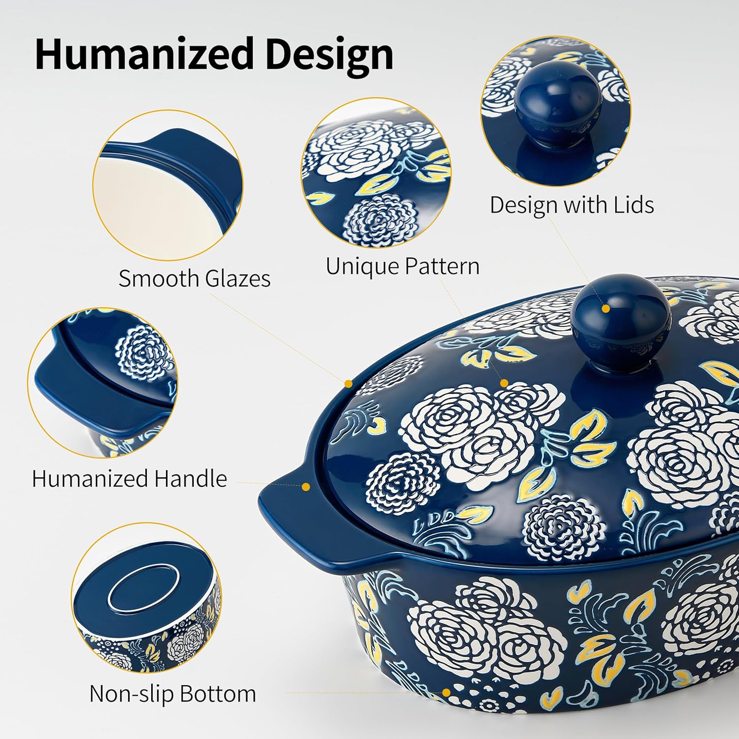 - 𝐔𝐧𝐢𝐪𝐮𝐞 𝐃𝐞𝐬𝐢𝐠𝐧: The Casserole Dish Set with Lids features beautiful pattern design and popular color for easy daily use. Hand painted flower pattern can be a charming decoration in your table and kitchen. It will be an excellent server for your table.