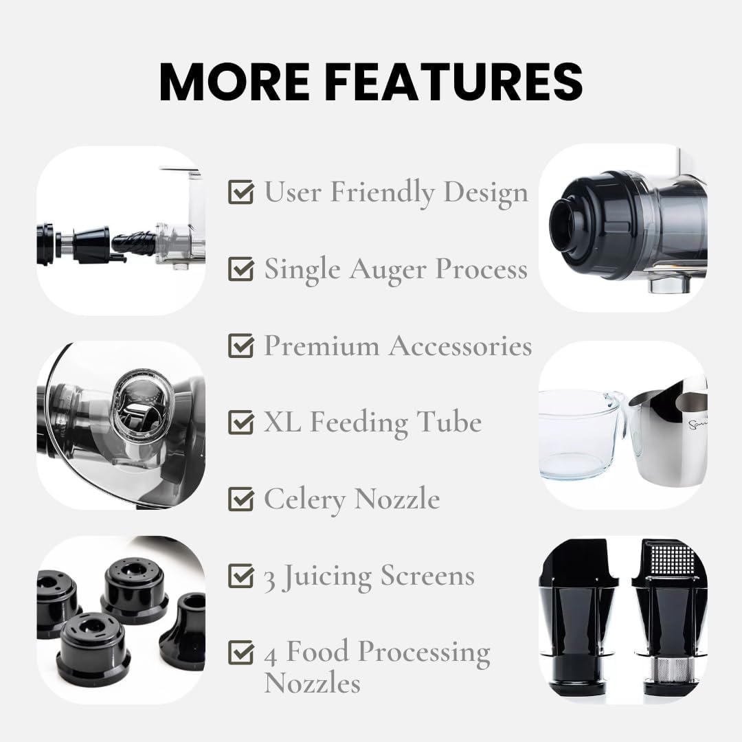 - MAX FLAVOR & NUTRIENTS - Not only has Horizontal Single Auger Slow Speed Juicer been designed with solid BPA free construction it also extracts rich and nutritious juices that tastes better at home, with a cleaner and more natural profile.