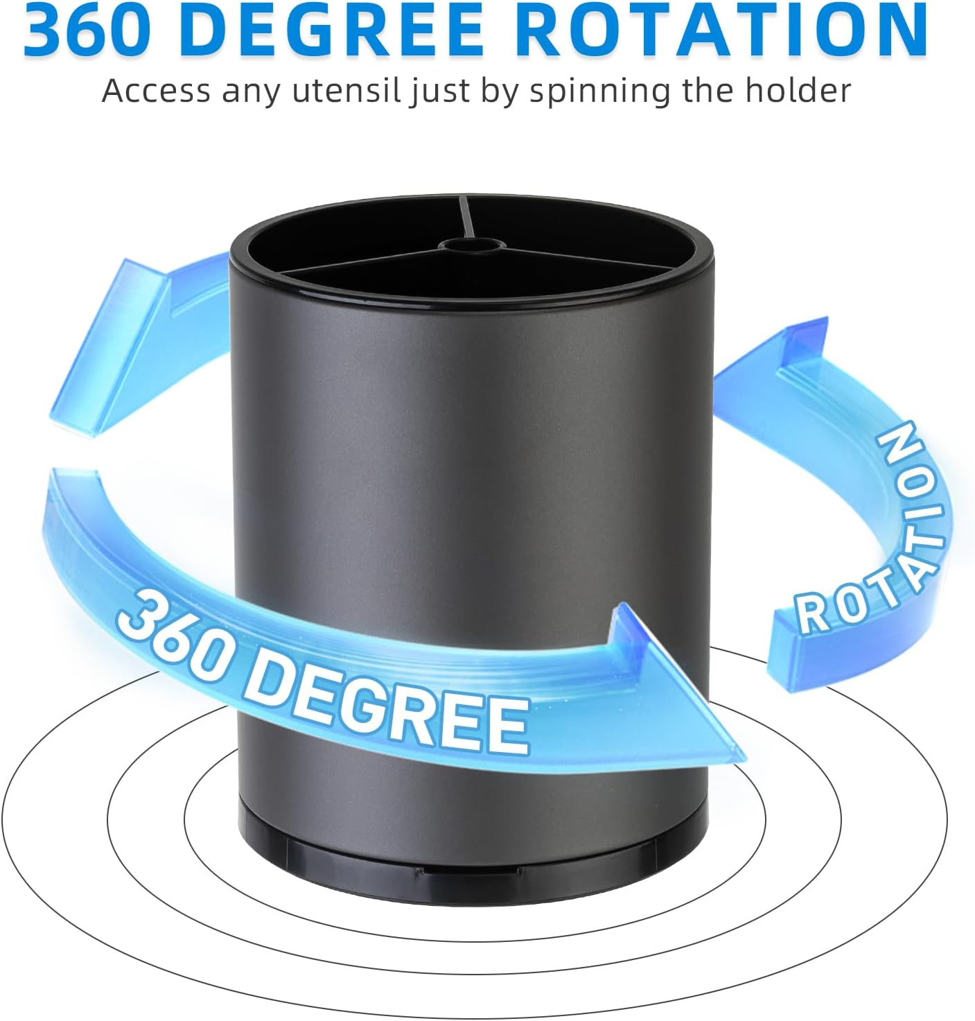 - 360° Rotating Utensil Holder: The 360° utensil caddy with rotating design makes it cooking tools are easy to use and also a great stress relieving companion in the kitchen.The large base of the utensil caddy on the kitchen countertop is equipped with 4 non-slip rubber pieces to secure utensils and prevent scratching the kitchen surface. It provides a simple and efficient storage solution for all your kitchen utensils.