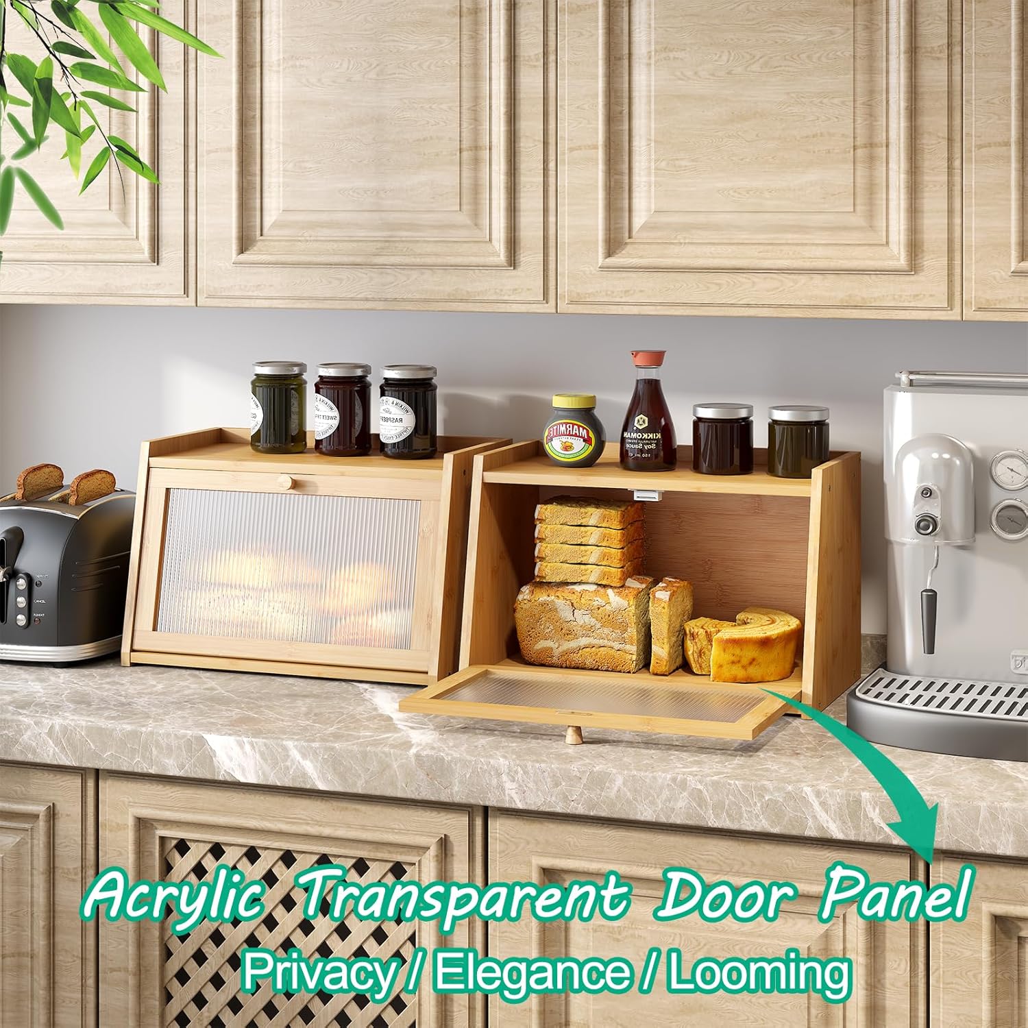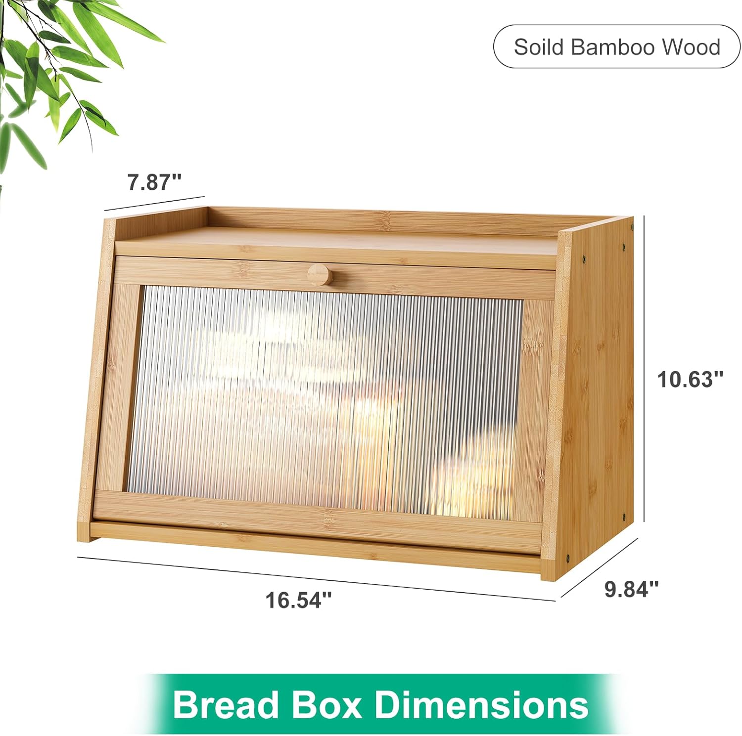 Bread Box for Kitchen Counter, Large Bamboo Bread Storage Container with Wavy Arcylic Door, Bamboo Wooden Farmhouse Bread Box for Your House (Natural, Medium)