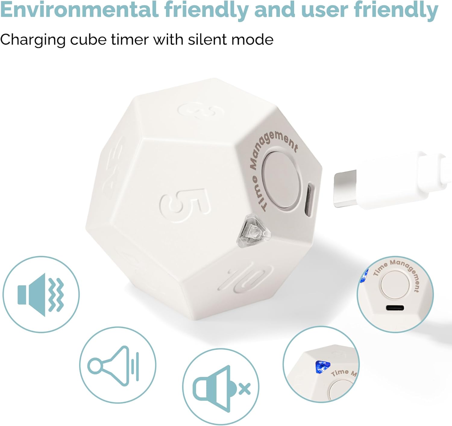 KADAMS Pomodoro Cube Timer Productivity-11 Preset Countdowns, Flip-to-Start Gravity Activation - Sound Vibrate Mute Rechargeable - Ideal for ADHD Kid Kitchen Classroom Cook Study Exercise - White
