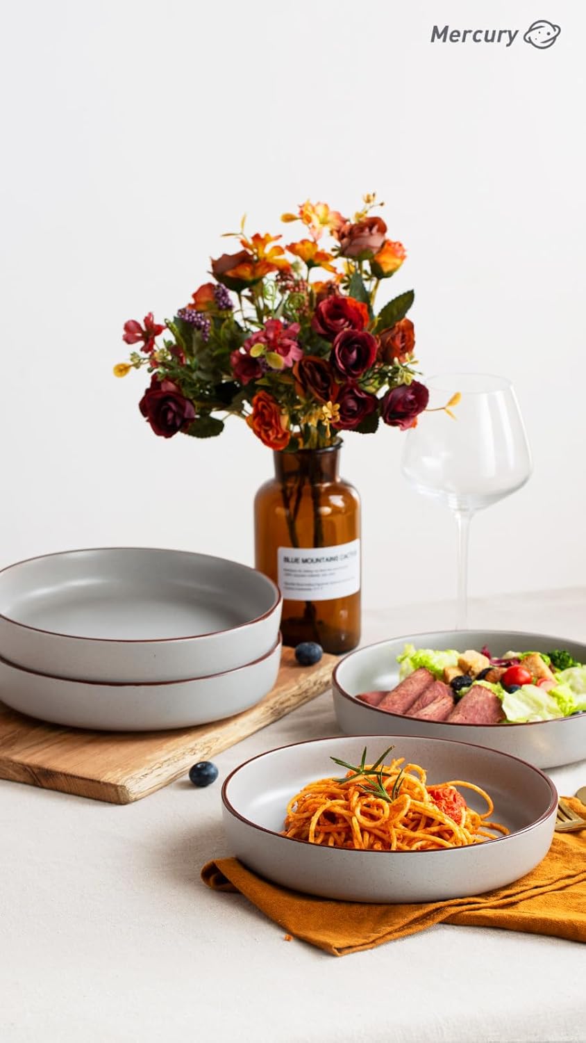 famiware Mercury Pasta Bowls Set of 4, 33 oz Large Salad Bowls, Ceramic Pasta Plates Bowls, Serving Bowls for Kitchen, Microwave & Dishwasher Safe, Light Gray