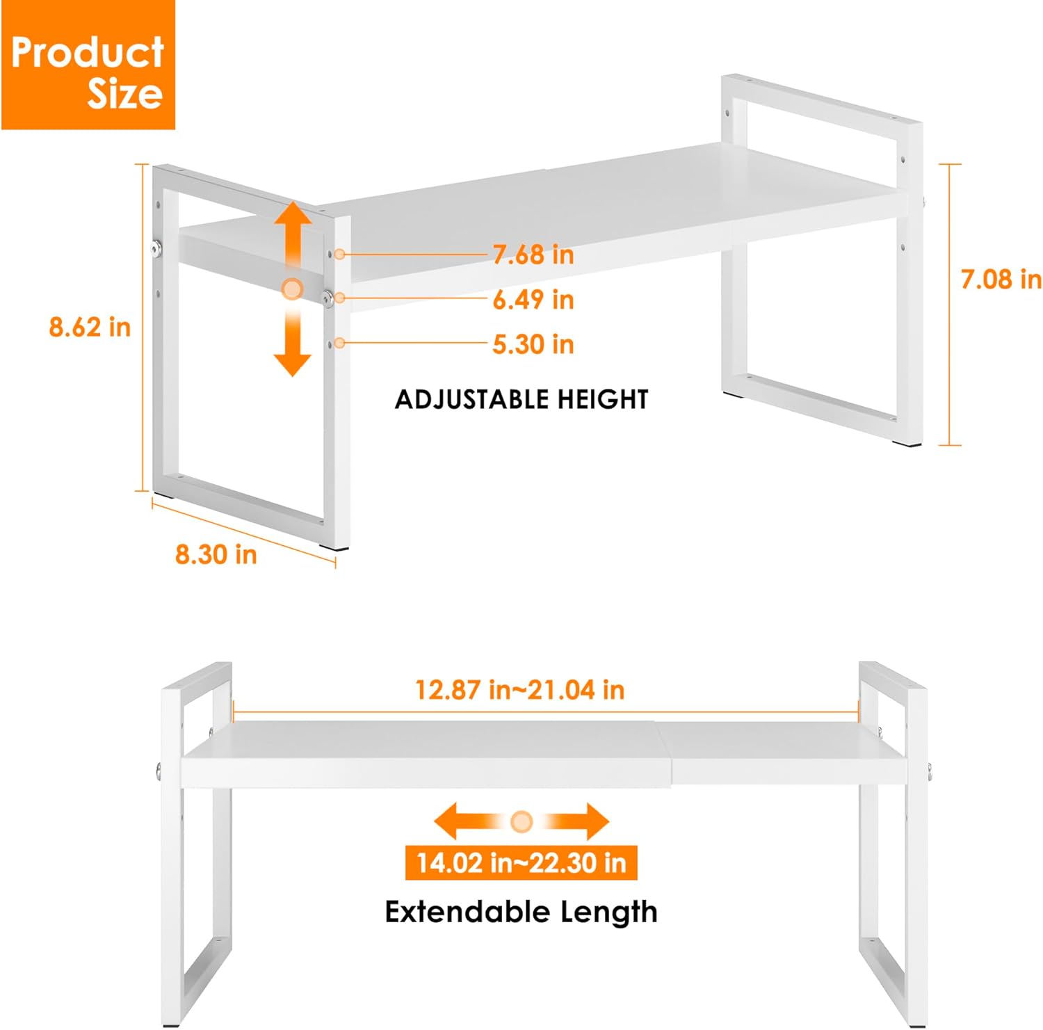 - 【Expandable & Stackable Cabinet Organizer】The length and height of this shelf can be adjusted, The length of expandable shelf can be adjusted from 12.87 to 21.04 Inches according to the different space; The Height can be adjusted from 5.3 inches to 7.68 Inches depending on how you want to arrange your space.