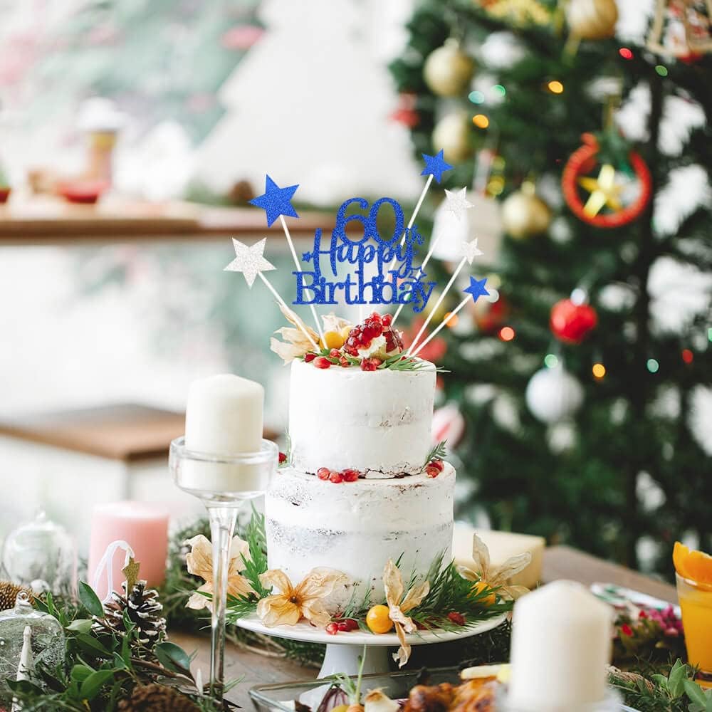 Glittery 60th Happy Birthday Cake Topper with Star,Personalised 60 Birthday Cake Toppers Party Decorations Party Supplies for Men Women Blue