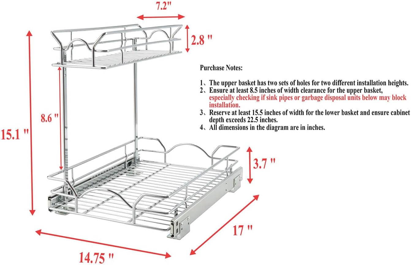 - EASY AND SIMPLE INSTALLATION: OCG under sink organizers and storage contains detailed instructions, mounting template and all the hardware needed for easy installation. Our cabinet organizer dimensions measure 14.75"W x 21"D x 15.1"H, Ensure at least 8.5 inches of width clearance for the upper basket, especially checking if sink pipes or garbage disposal units below may block installation. Reserve at least 15.5 inches of width for the lower basket and ensure cabinet depth exceeds 22.5 inches.
