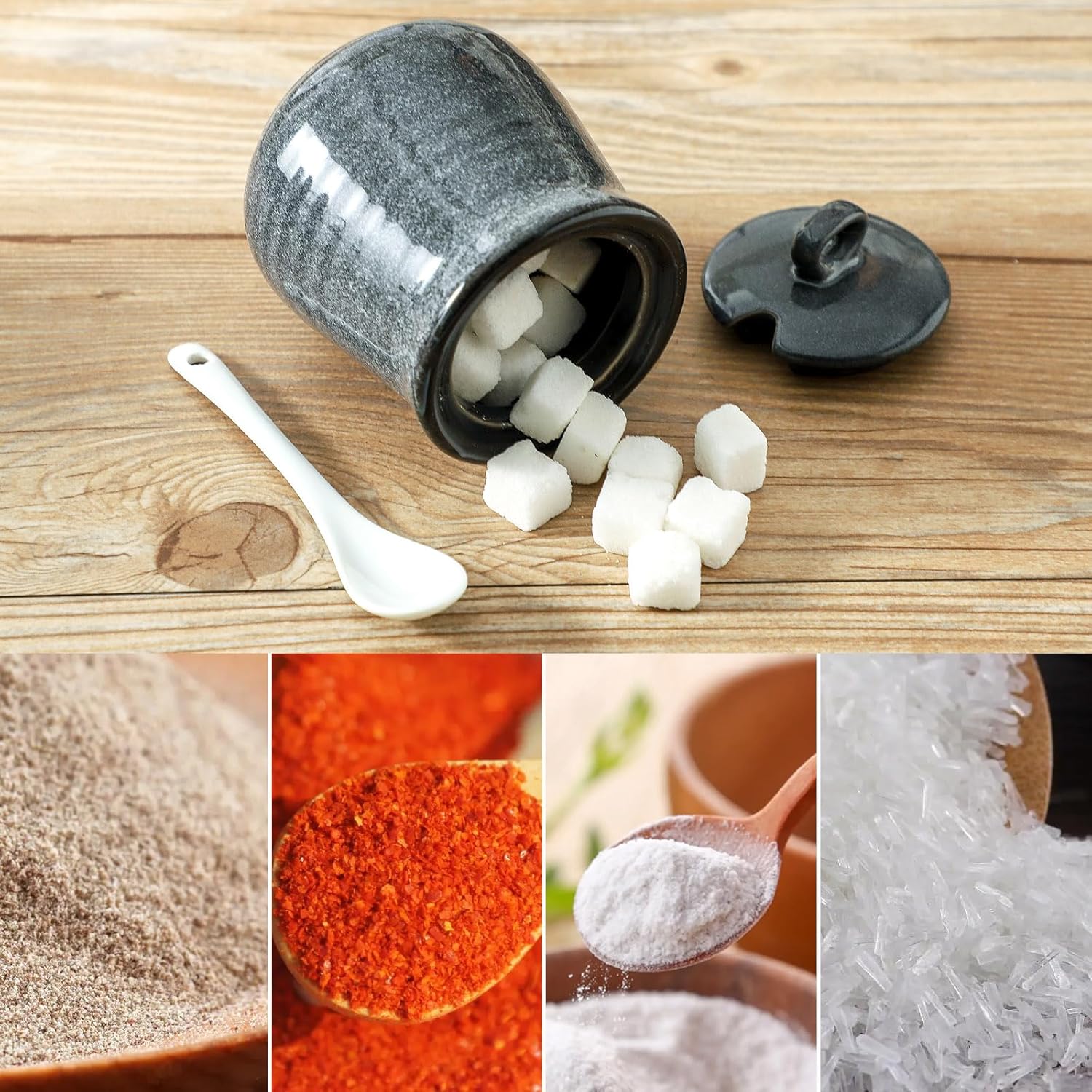 - Multifunctional Set: This combination consists of a sugar bowl and a coffee creamer container. The sugar dish with a lid can store not only sugar, but it can also be used to store salt, monosodium glutamate, pepper and other seasonings, and it also has a spoon to improve the convenience of daily use