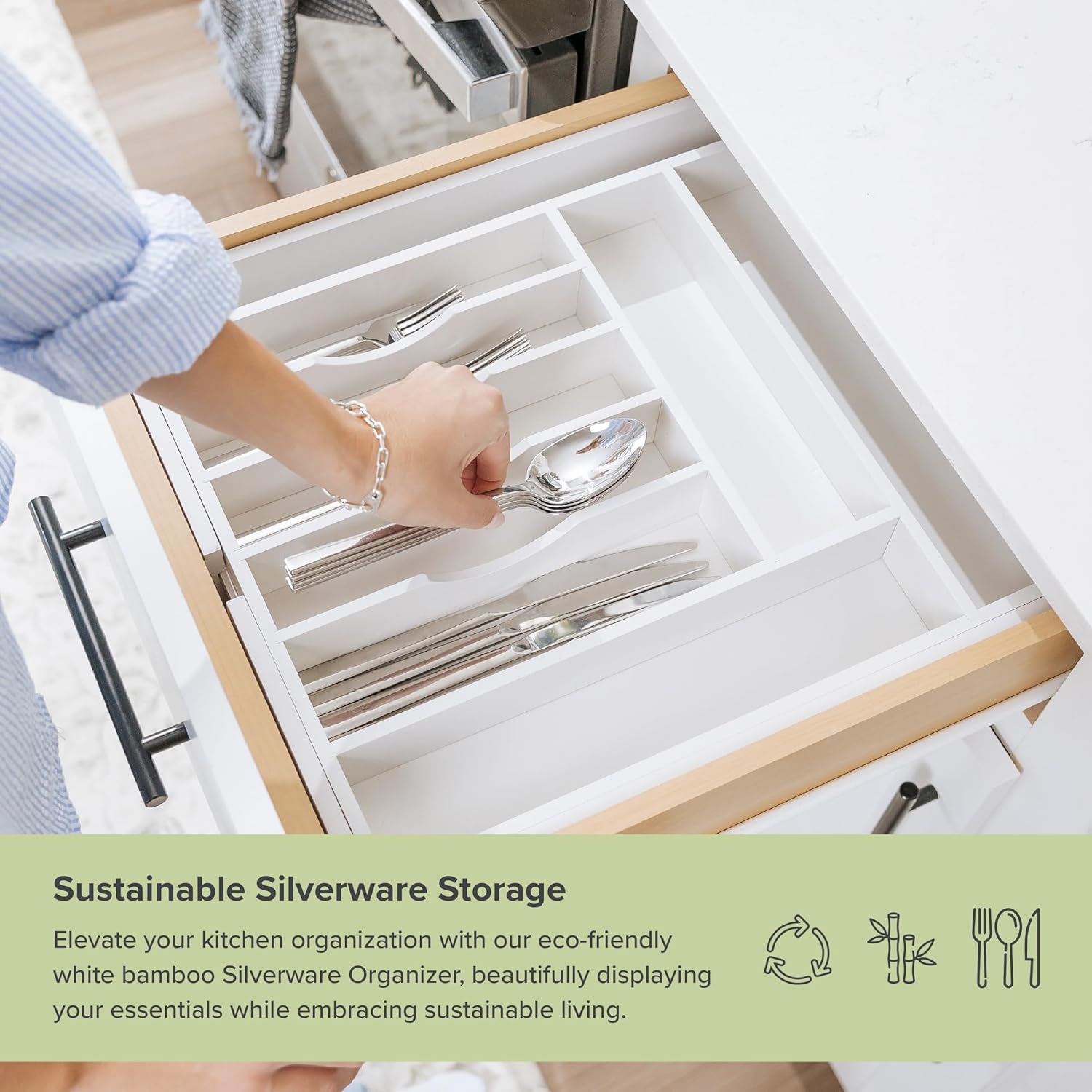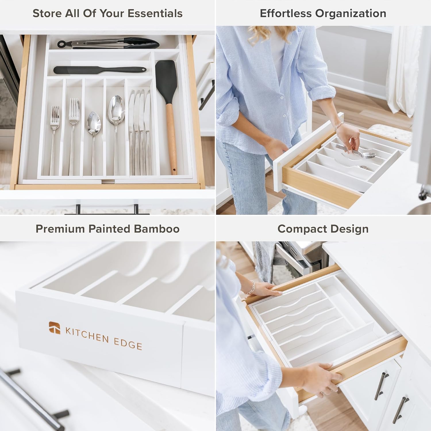 KitchenEdge Premium Silverware, Flatware and Utensil Organizer for Kitchen Drawers, Food-Safe Contract Grade, Expandable from 14.5 to 25 In, White Bamboo