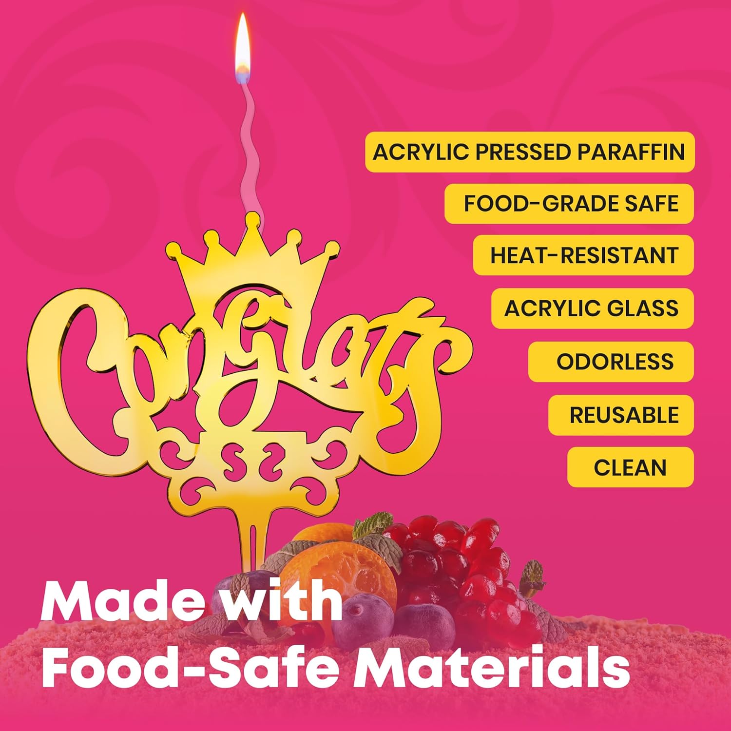 Congrats Reusable Gold Cake Candle - Luxury Cake Topper Candle for Birthdays, Weddings & Anniversaries - Reusable Food Safe Acrylic, Shiny Mirror Finish - Happy Birthday Cake Topper Decor