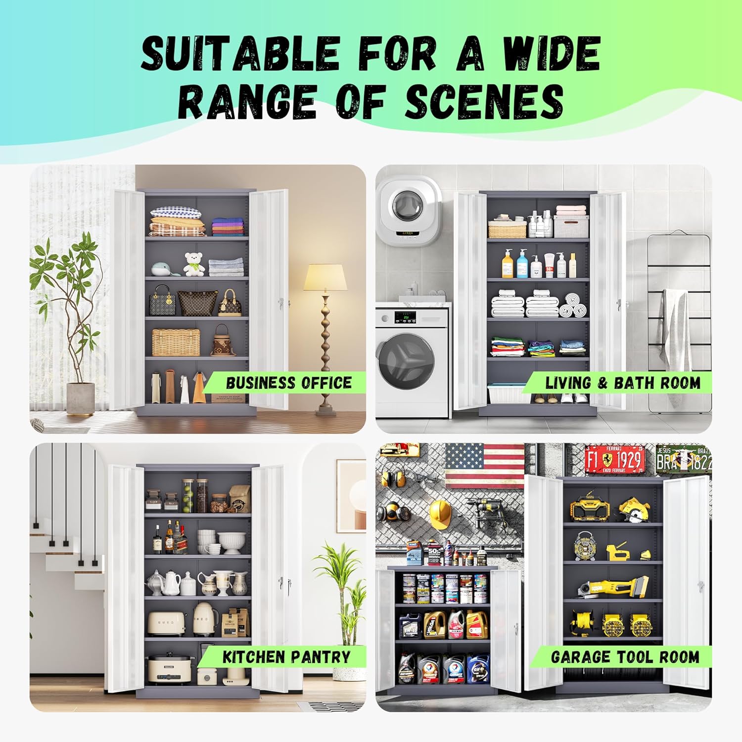 INTERGREAT Storage Cabinet, 72” Steel Locking Closet with Doors and 4 Adjustable Shelves, Tool Unit for Home Office, Garage & Tall Lockable File Cabinet, Grey White.