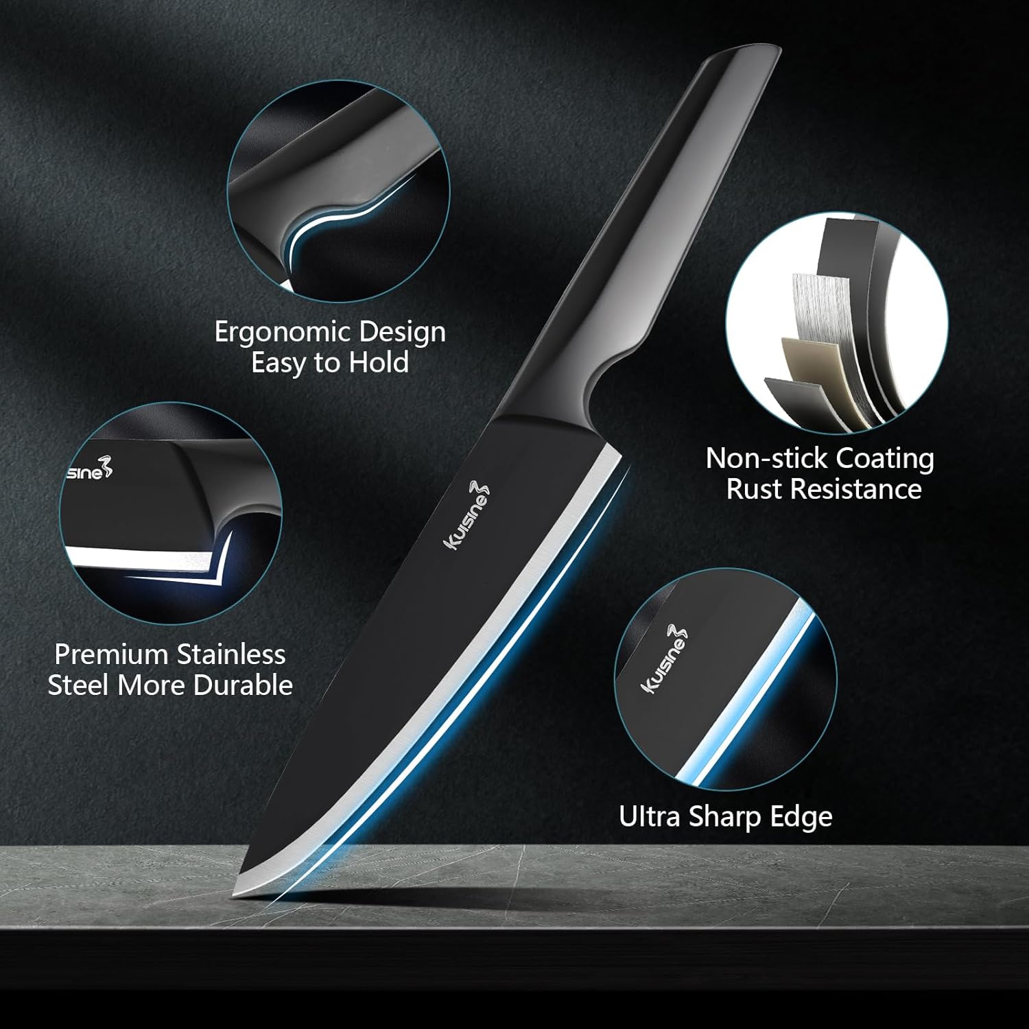 - Exquisite Non-slip Handle:KUISINE sharp knife set is patented with the ergonomic and comfortable handle, which is made of quality high carbon stainless steel and give you a solid hold feeling.