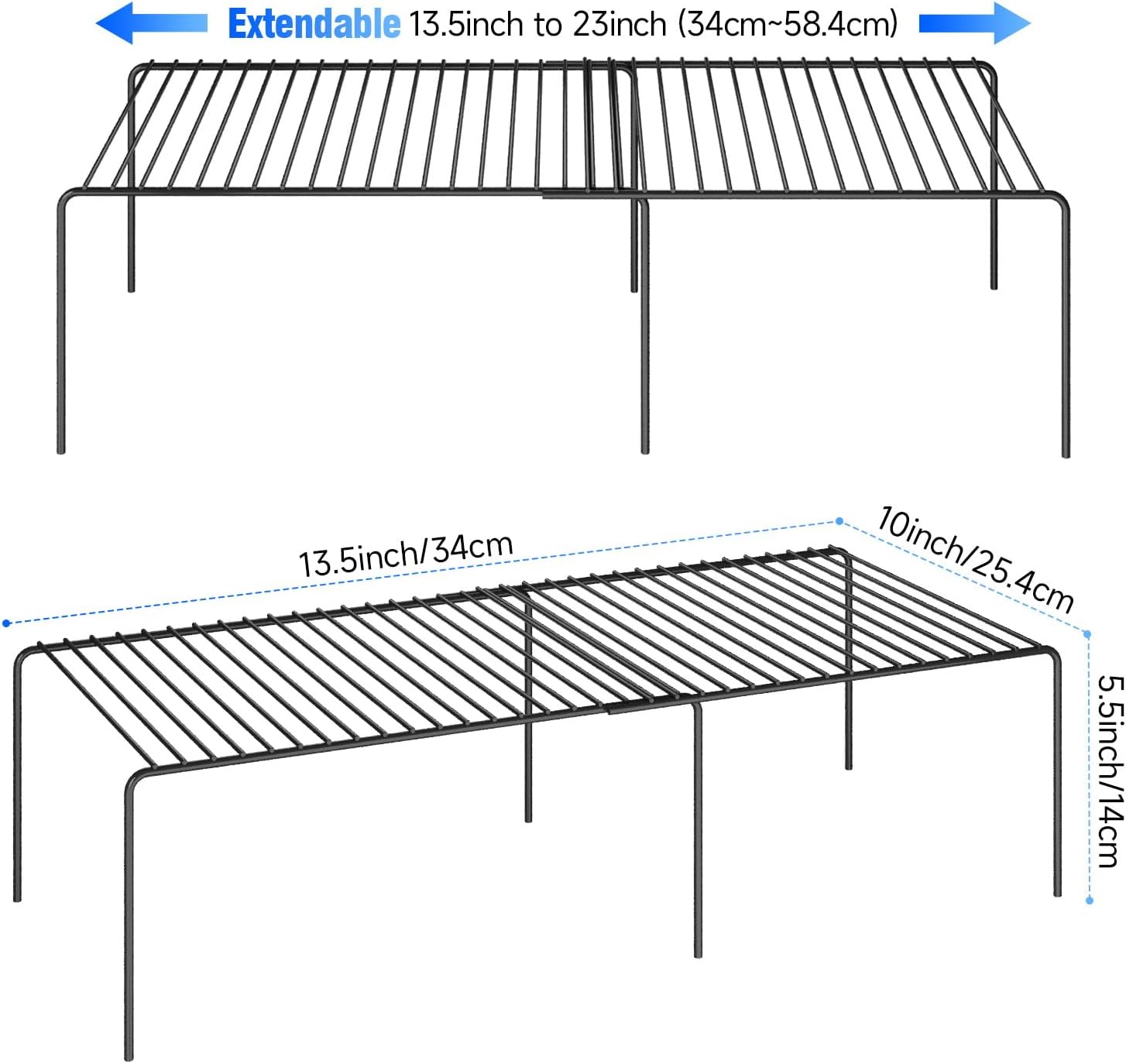 - Expandable Design: The extended design allows for additional storage space to maximize space utilization, and this versatile shelf can be expanded from 13.5 "to 23". This product is tailor-made for customers who face difficult product selections. Size:13.5" to 23" L x 9.4" W x 5.5" H