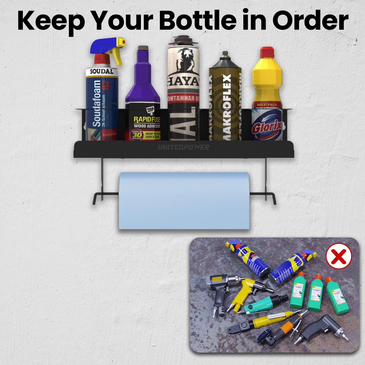 UNITEDPOWER 5 Aerosol Spray Can/Paper Towel Holder, Paint Bottle Storage Rack, Steel Wall Mount Shelf, Tool Organizer for Garage, Craft Workspace and Home