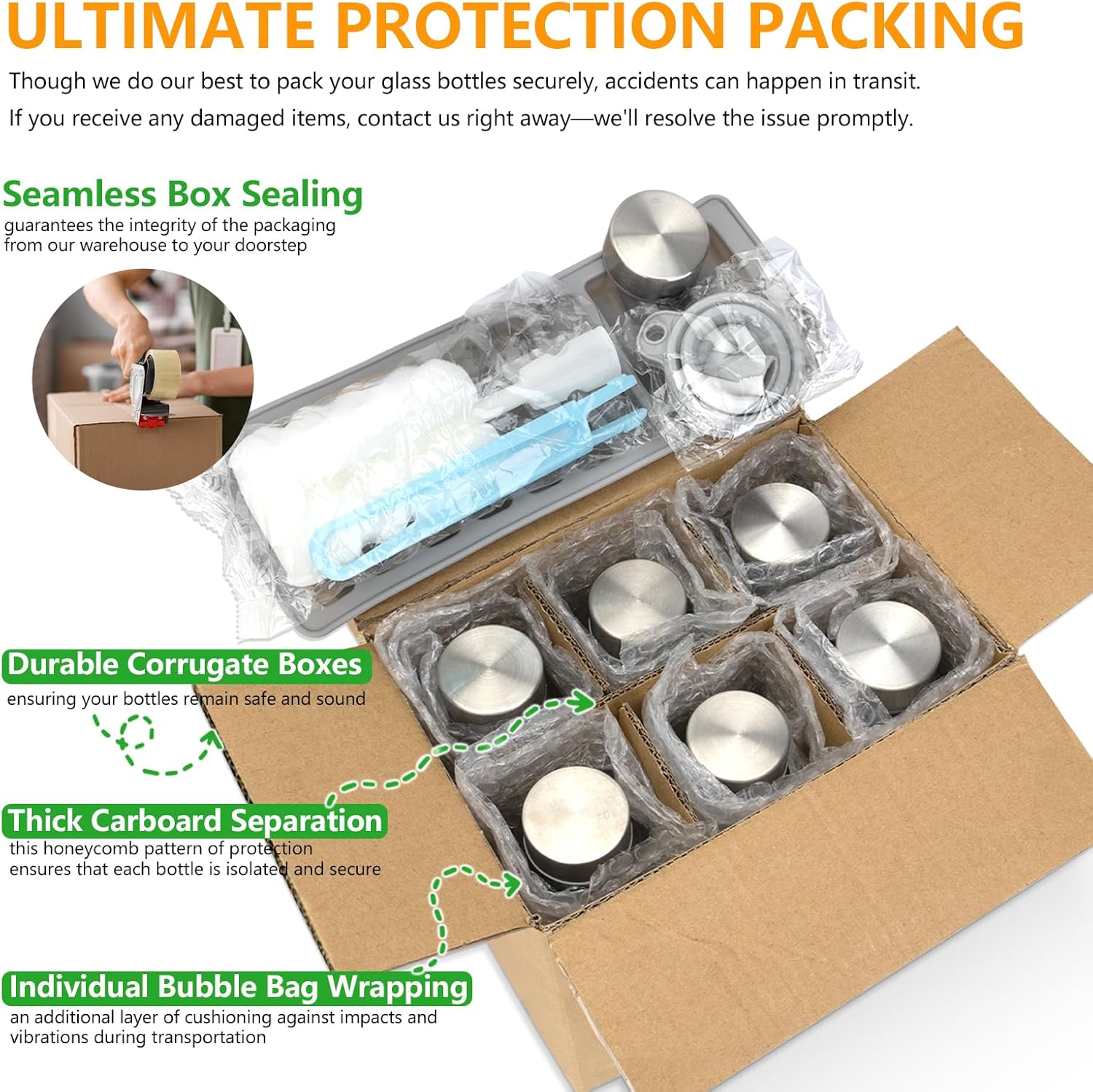 - AIRTIGHT AND LEAK PROOF: Juicing Kit Bundle includes : 6 pack clear 18 oz Zukro glass juice bottles with airtight lids, a bottle cleaning brush for easy hand washing, a funnel helps you pour liquids inside the glass containers, an ice stick tray makes long and narrow ice cubes for adding ice easily, extra 1pc stainless steel airtight lids to ensure that the reusable glass bottles always remain sealed. Get our juicing bottles in bulk packs as gift for your whole family and friends.