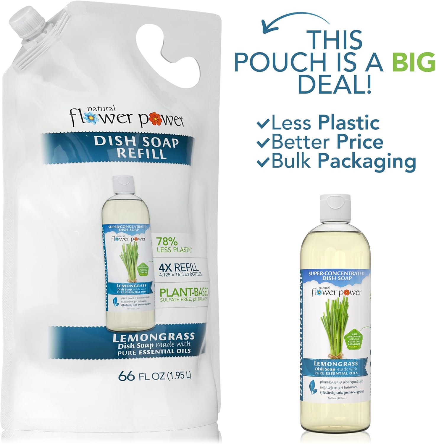 - REFILLS 4X – These 66 fluid ounce refills will refill the 16 fluid ounce bottles 4 times! Our refills use 78% less plastic and are economical for the earth and your wallet. Natural Flower Power Dish Soap Bottles are 16 fluid ounces and come with convenient flip-top lids that will not clog. Available in 5 scents: Citrus & Spice, Lavender, Lemongrass, Peppermint & Lemon, and Free & Clear (Unscented).