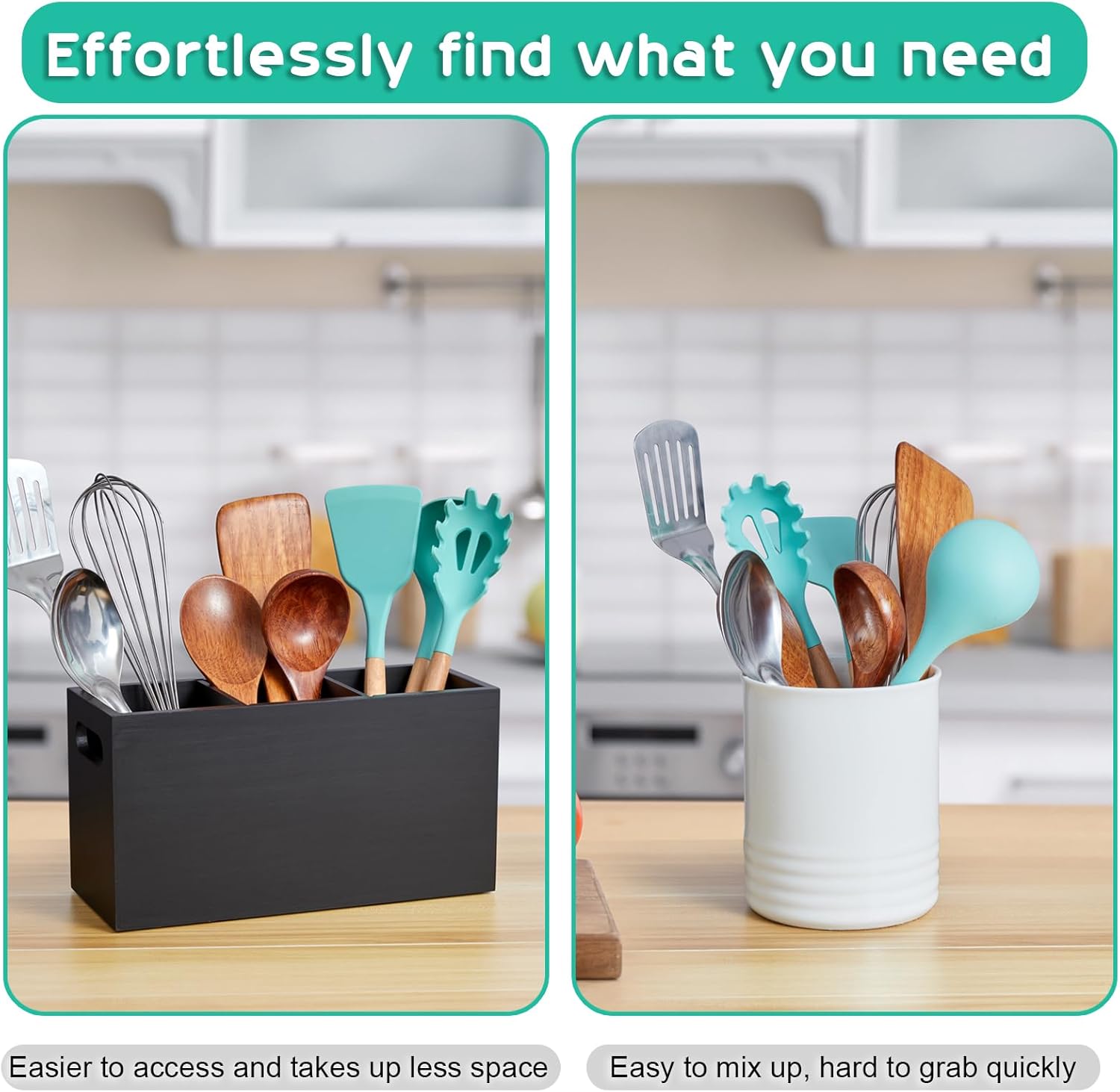 - Clutter Free Storage - Our 3-compartment utensil holder allows you to organize your most frequently used kitchen utensils based on different materials, saving drawer or countertop space and making your cooking tools easily accessible.