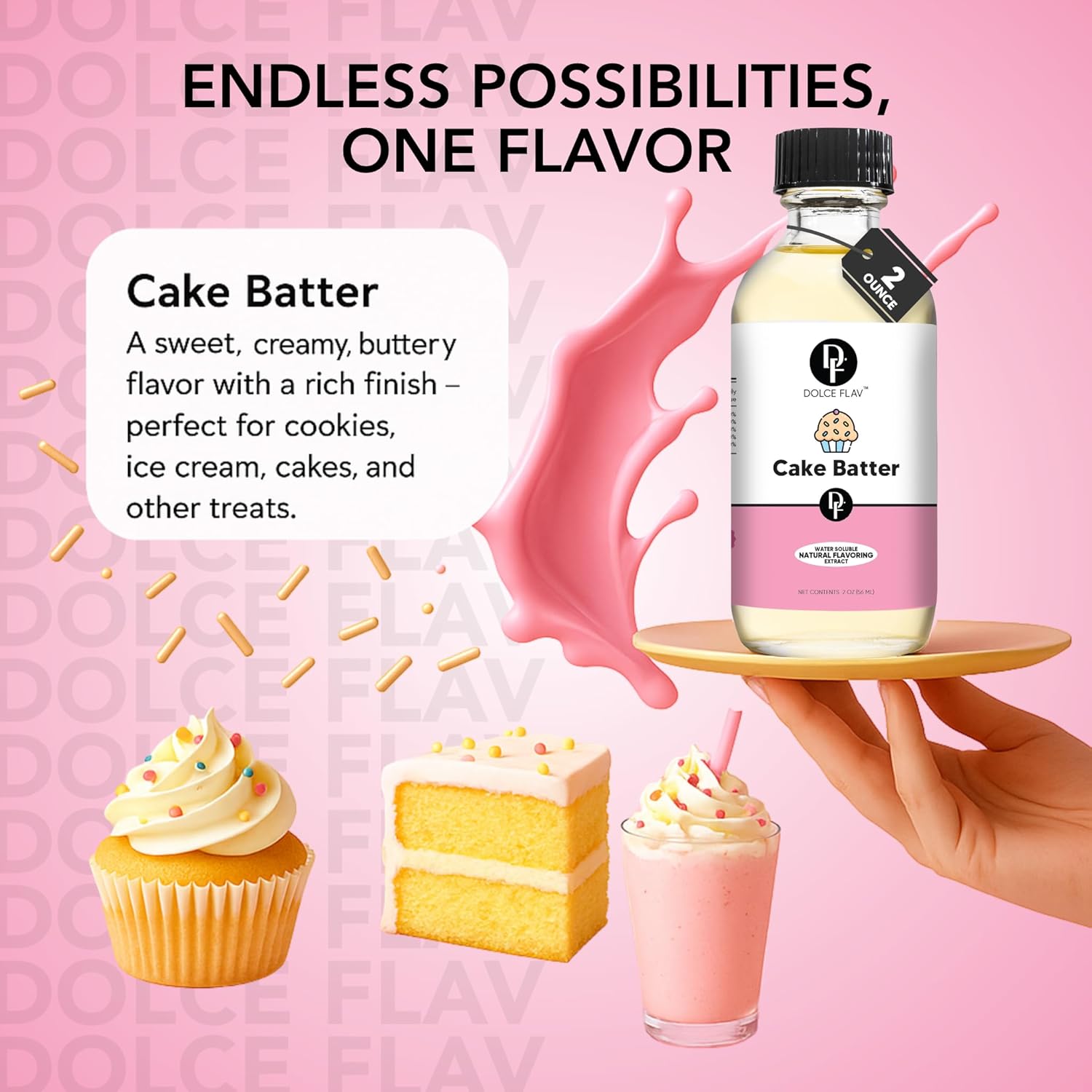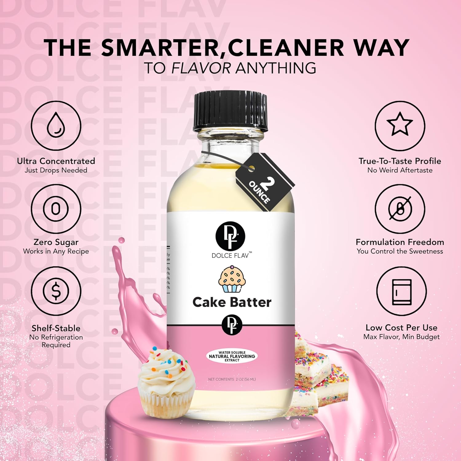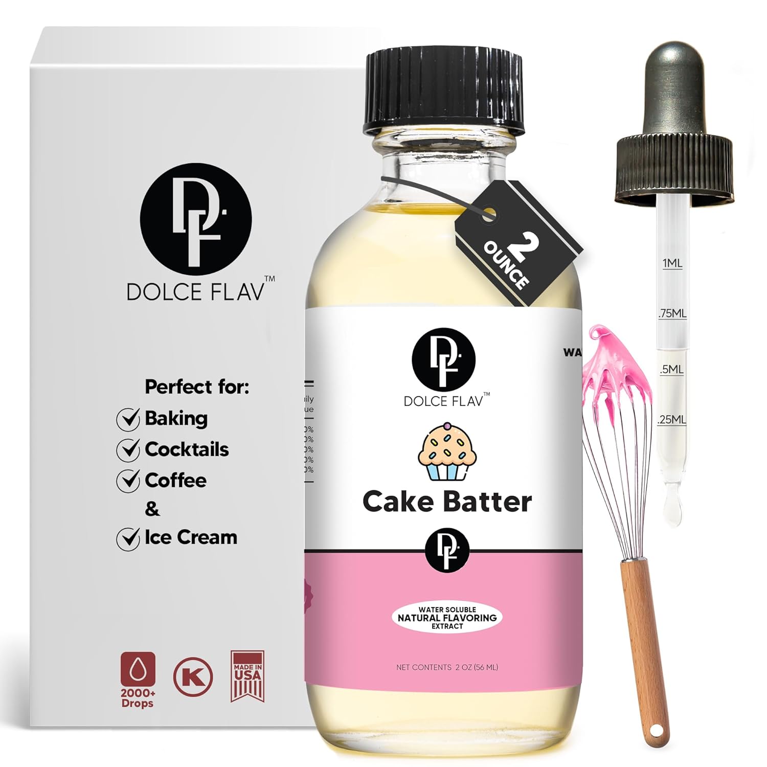 Dolce Flav Natural Cake Batter Extract – 2 Ounce Water-Soluble Kosher, Sugar-Free, Concentrated Birthday Cake Flavor for Frosting, Cupcakes & Ice Cream, Includes Measured Dropper