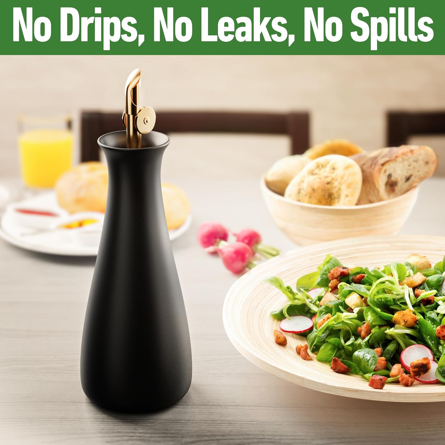 - SELF-CLOSING GOLD SPOUT - This leak proof oil dispenser has a snug fit stainless steel nozzle that opens and closes itself whilst giving the perfectly smooth pour with no leaking or dripping. To protect the beautiful gold spout, we do not recommend using vinegar with this no drip oil dispenser.
