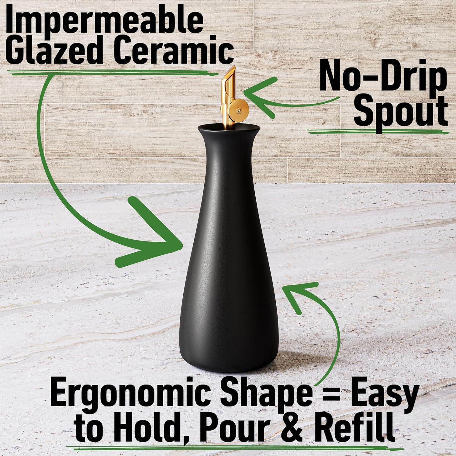 - DURABLE CERAMIC OIL DISPENSER - This thick ceramic olive oil dispenser has an impermeable glaze inside and out so that oil will not seep through, as well as enabling it to withstand heat exposure and frequent use. The bottle is dishwasher safe. We recommend hand washing the spout.
