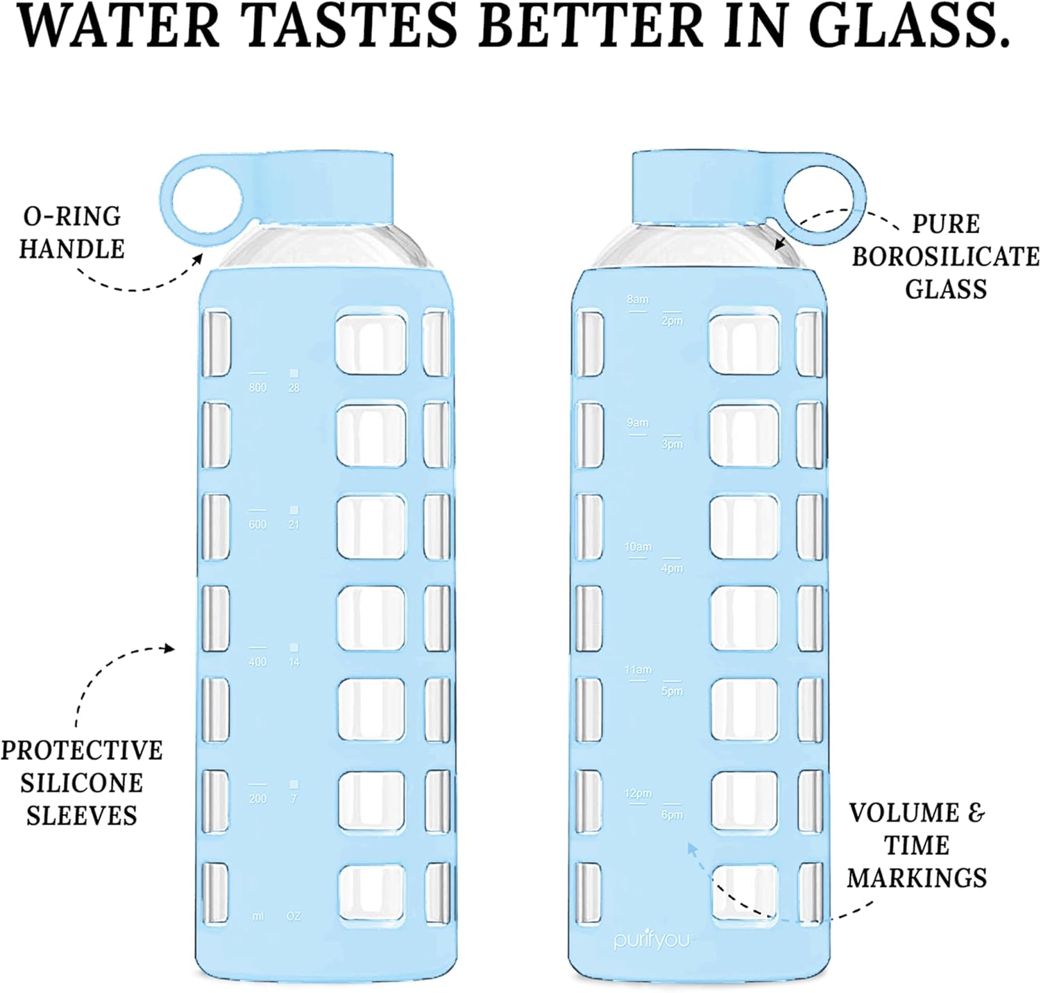 purifyou 40oz / 32oz / 22oz / 12oz Borosilicate Glass Water Bottle with Time & Volume Markers, Silicone Sleeve, Stainless Steel Lid – Reusable Glass Bottle for Water & Juice (40oz Ice Blue)