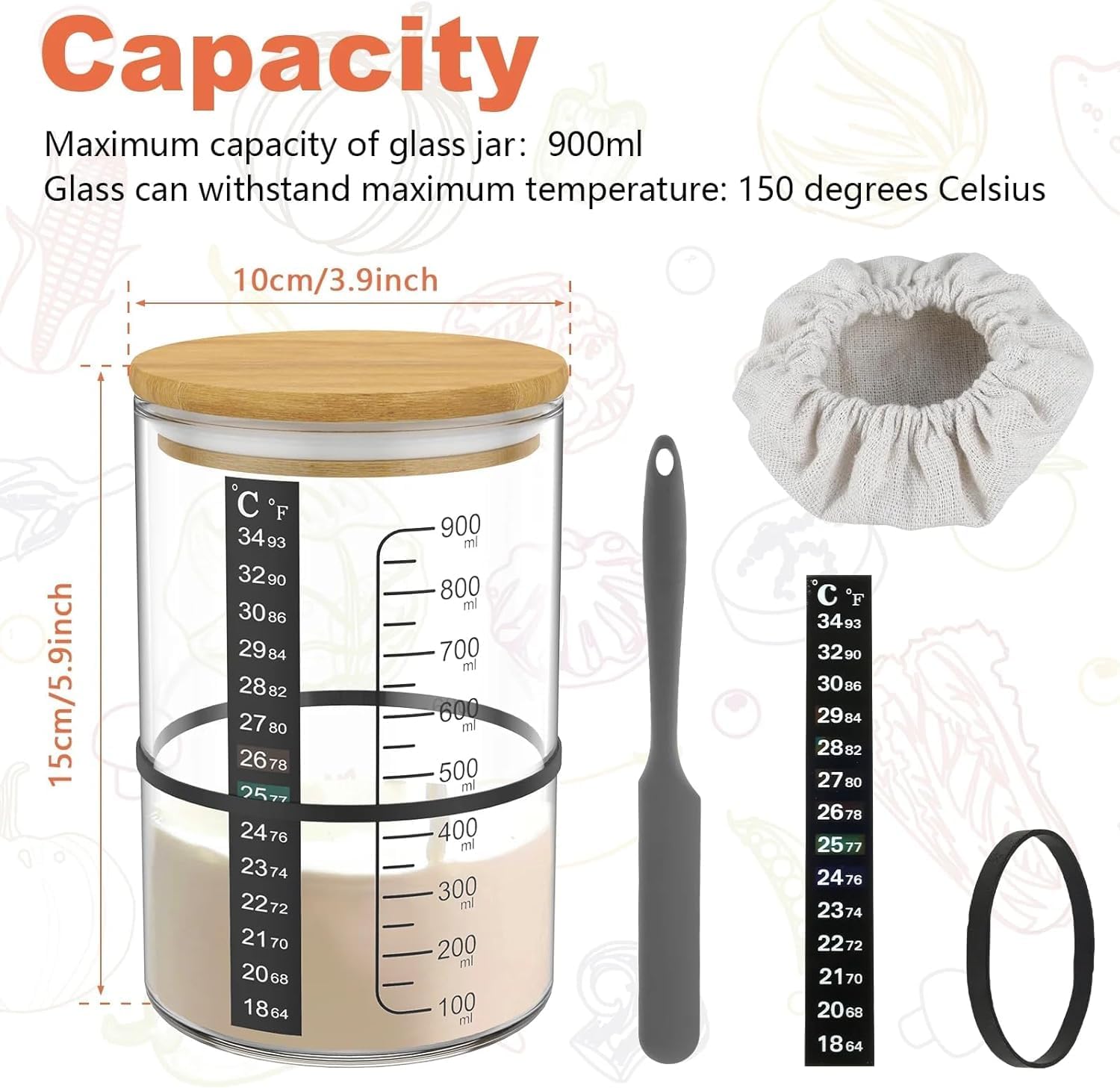 - π Perfect Addition To Your Bread Making Tools & Supplies- This sourdough jar kit comes complete with volume, net weight & feed line marks, thermometer, cloth cover, silicone cover/base & spatula.