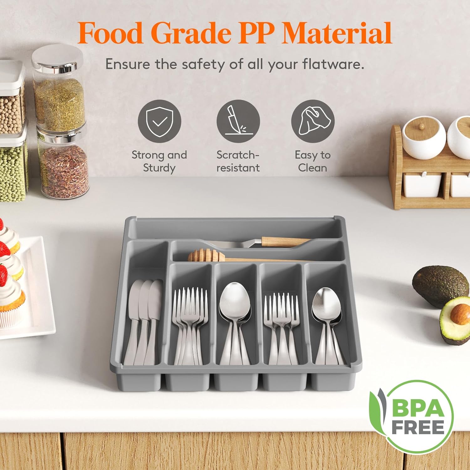 - Robust and Safe: This kitchen drawer organizer is crafted from premium PP material, BPA-free and built to last. It ensures your silverware is stored in a healthy, safe environment for worry-free use
