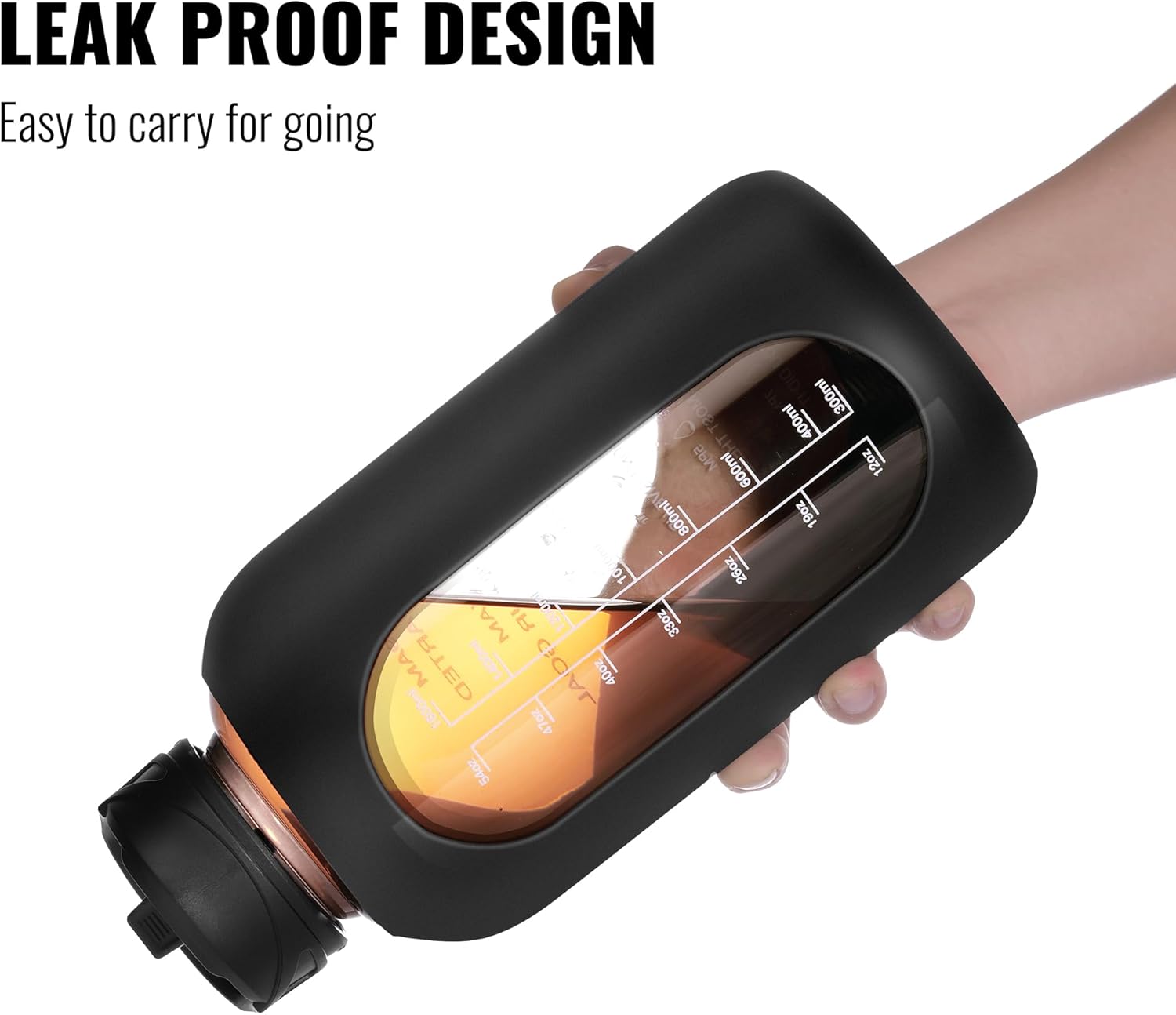 - GLASS WATER BOTTLE WITH SILICONE SLEEVE: The big water bottle for easy carry and use. The color of the silicone sleeve varies and stylish, provides impact protection, easy grip, no slips and reduced condensation. Enjoy the happy hour of drinking water