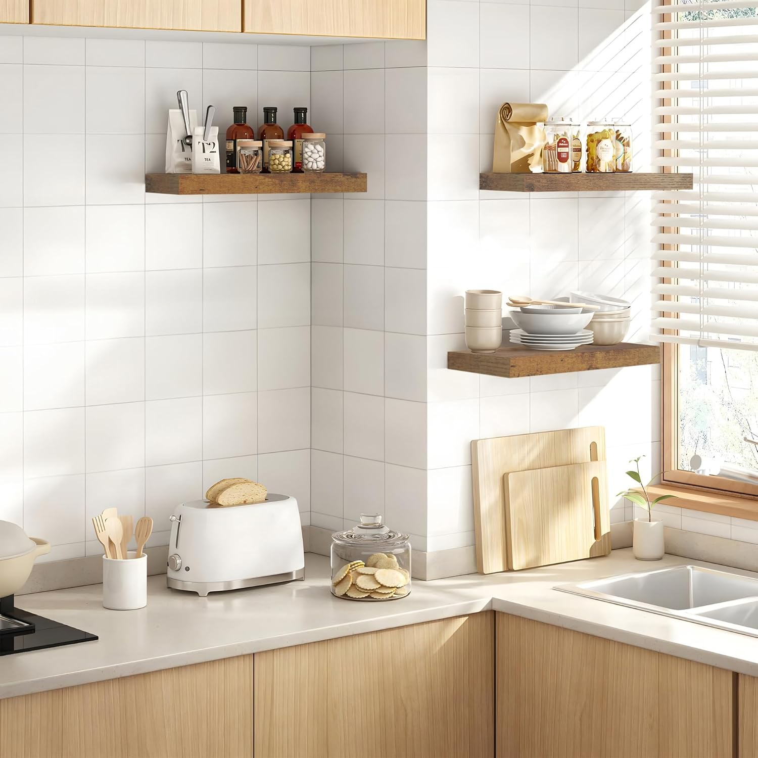 - STRONG AND DURABLE: Crafted from high-quality materials, these kitchen wall shelves are 1.3 inches thick and 9 inches wide, capable of holding up to 50 pounds. Solid brackets ensure no sagging or wobbling, providing reliable support for your favorite items.
