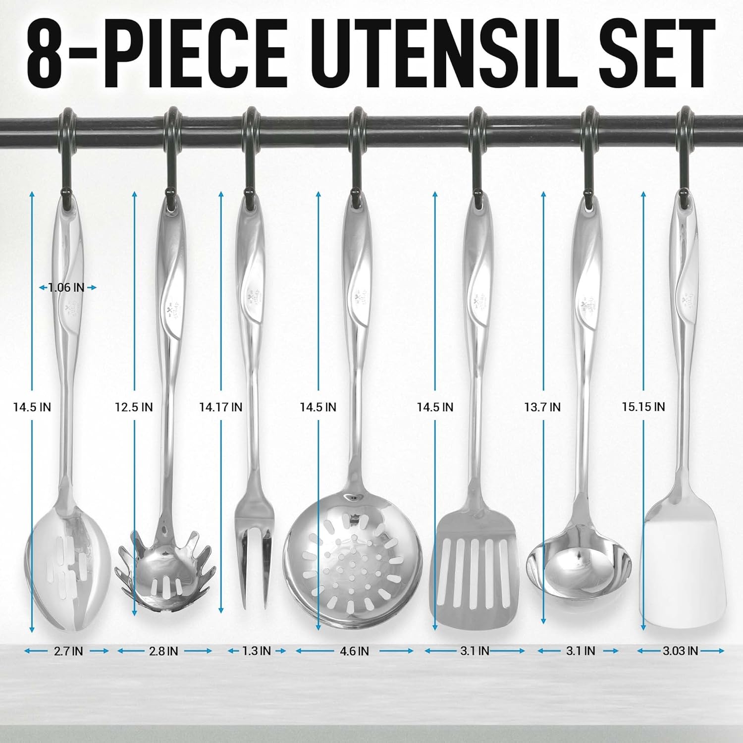- Elegant & Sleek Cooking Set: Considering an upgrade to your everyday cooking tools? Look no further, we got the right set of utensils for you. Introducing The Zulay Kitchen 8-Piece Cooking Set made from premium quality stainless steel that is durable, sturdy, and long-lasting. This set comes with a slotted spatula, spaghetti server, draining spoon, ladle, cooking fork, utensil crock and non-slotted spatula.