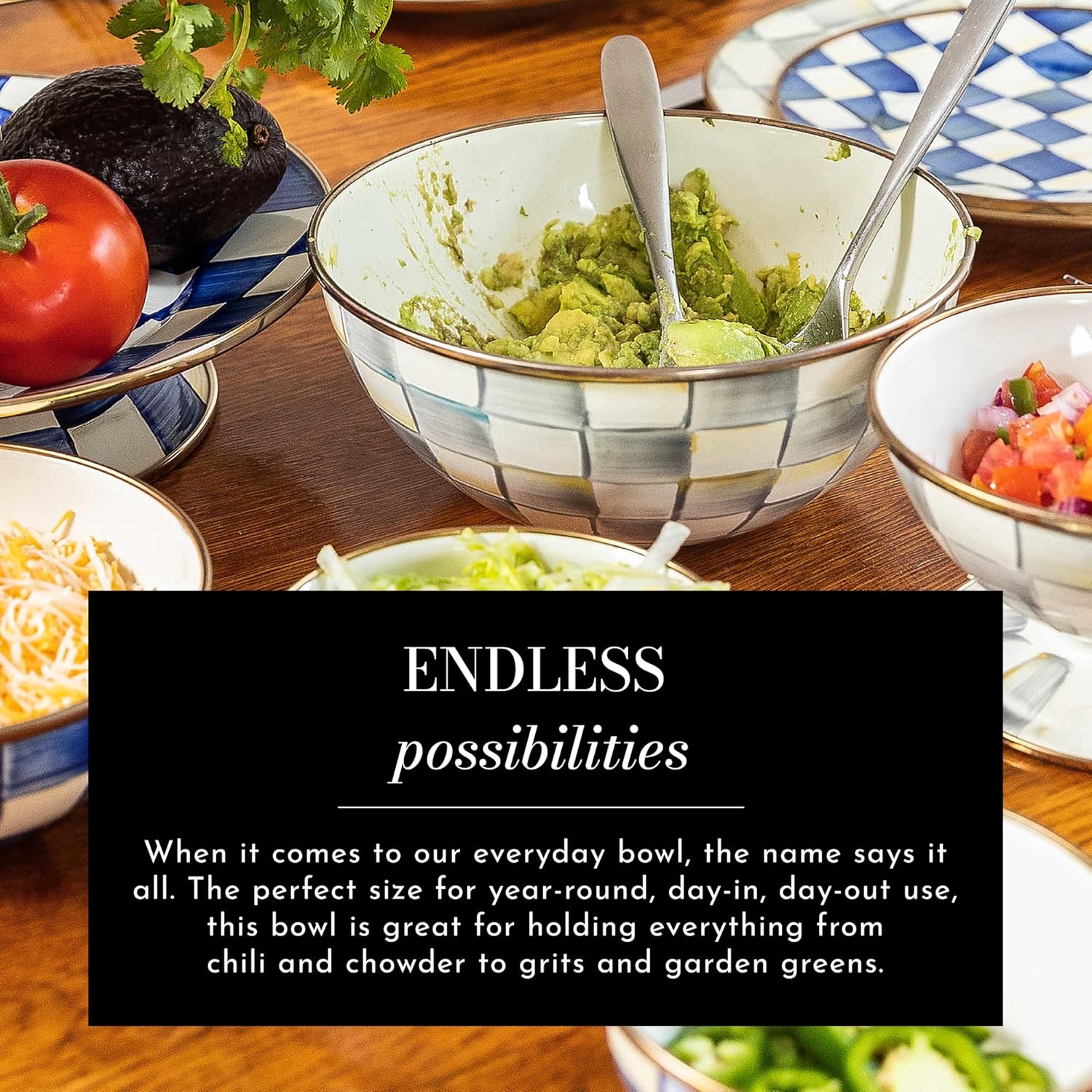 MACKENZIE-CHILDS Enamel Everyday Bowl, Serving Bowl for Entertaining, Medium, Gray-and-White Sterling Check, Set of 1