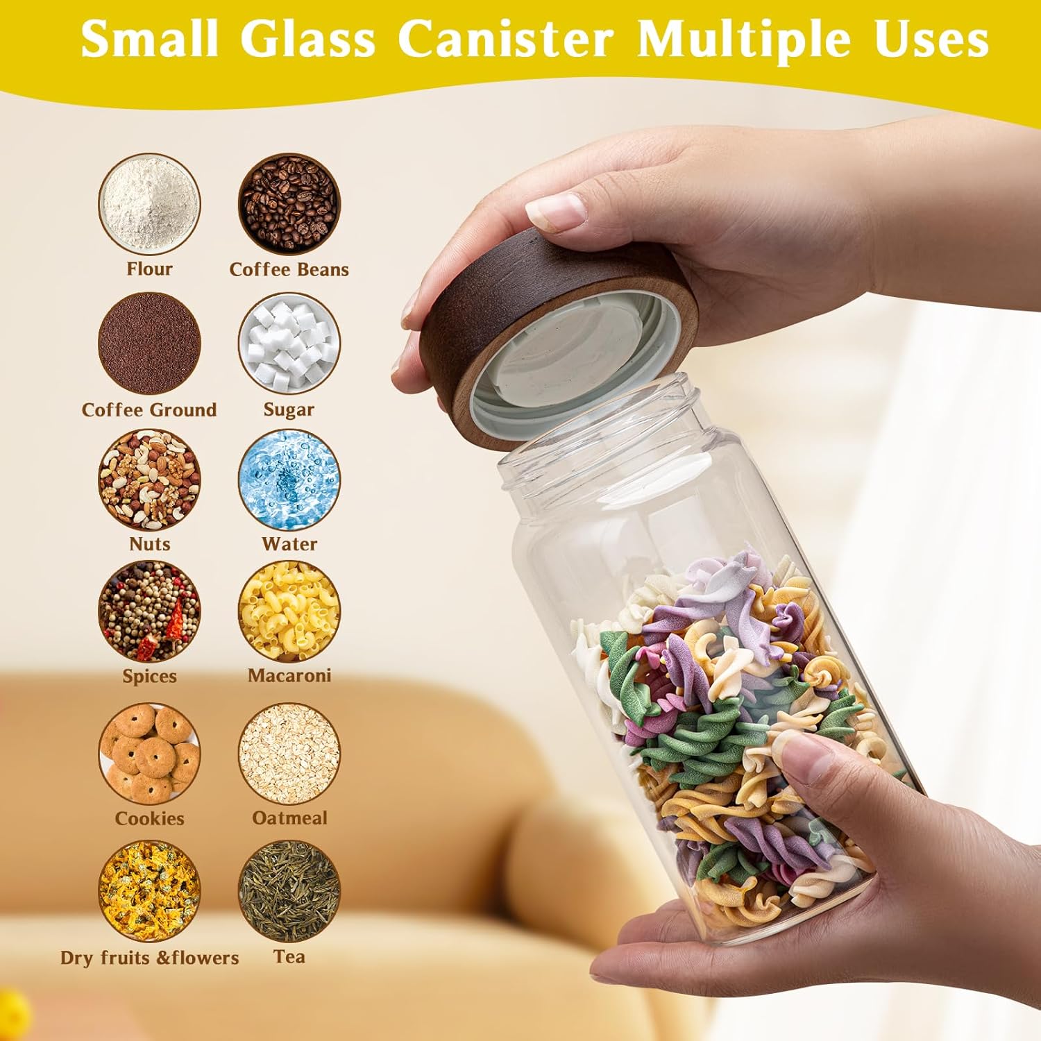 - 【WIDE APPLICATIONS】Glass canning jars storage are suitable for storing various dried ingredients to retain their freshness.Glass jars with wood lids perfect for storing dry food , such as,cookies,dried beans,pepper,oatmeal,jams,chutneys, rice, flour, tea, coffee, biscuits, candy,cheese,flour, sugar, seeds,etc. Keep your kitchen tidy and safe,saving space and convenient .