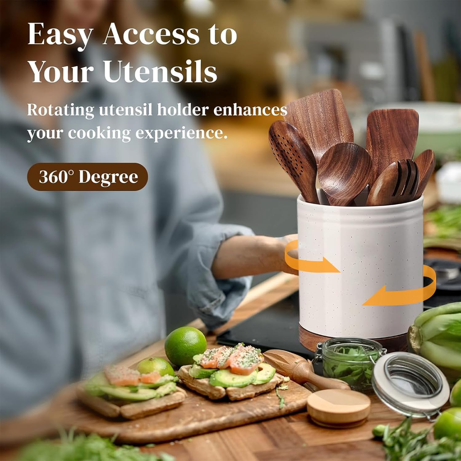 - 360° Rotating Convenience: Simplify your cooking routine with our rotating utensil holder! No more fumbling for tools—this kitchen utensil holder features a smooth, silent spin for a noise-free experience. Designed like a lazy susan, the spinning utensil holder allows you to easily grab the right spatula or tool with just a quick turn. Keep your kitchen organized and make cooking more efficient with this practical cooking utensil holder.