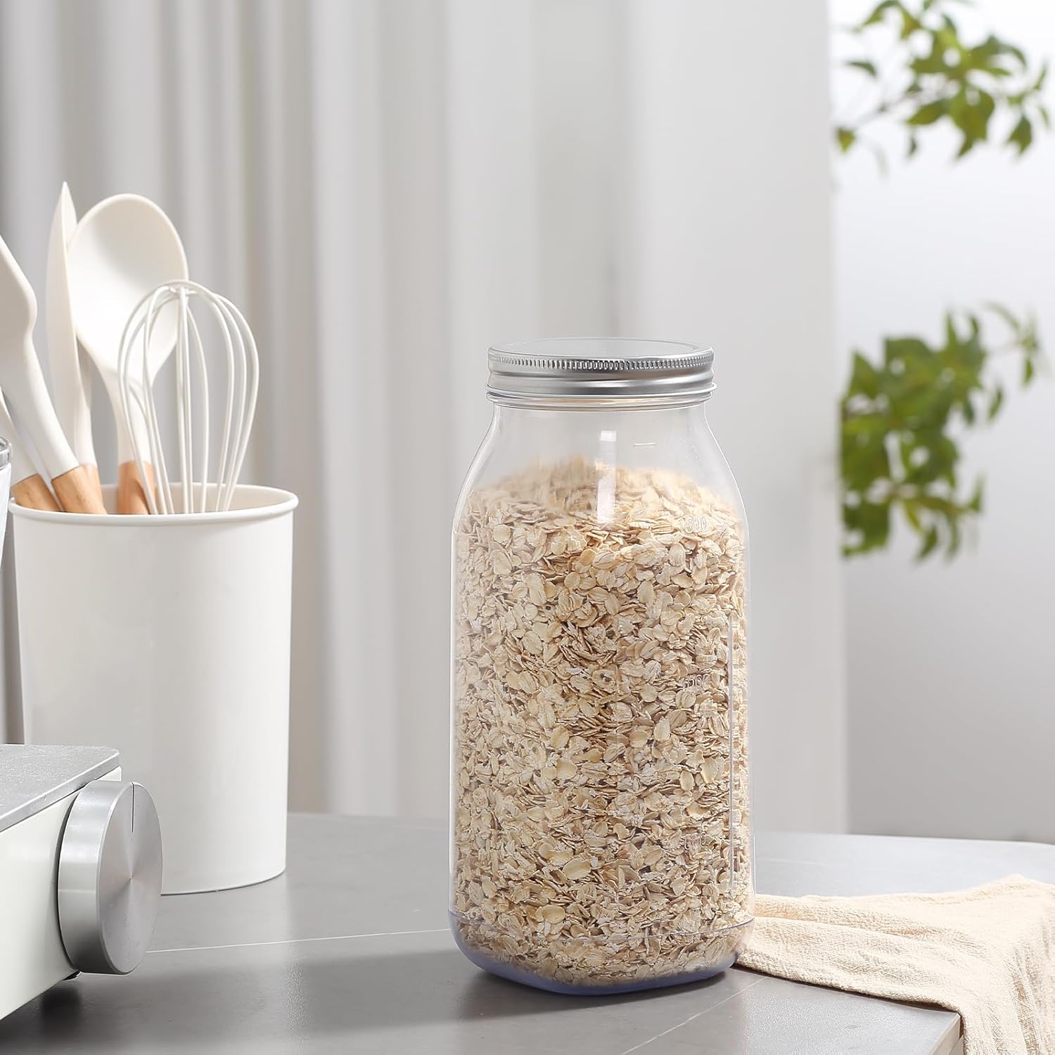 novelinks 64 oz Large Plastic Jars with Metal Lids - 4 Pack BPA-Free Clear Storage Containers for Pantry, Pickles, Sauces, Flour, Snacks - Leak-Proof Airtight Food Grade Jars for Kitchen (Silver)