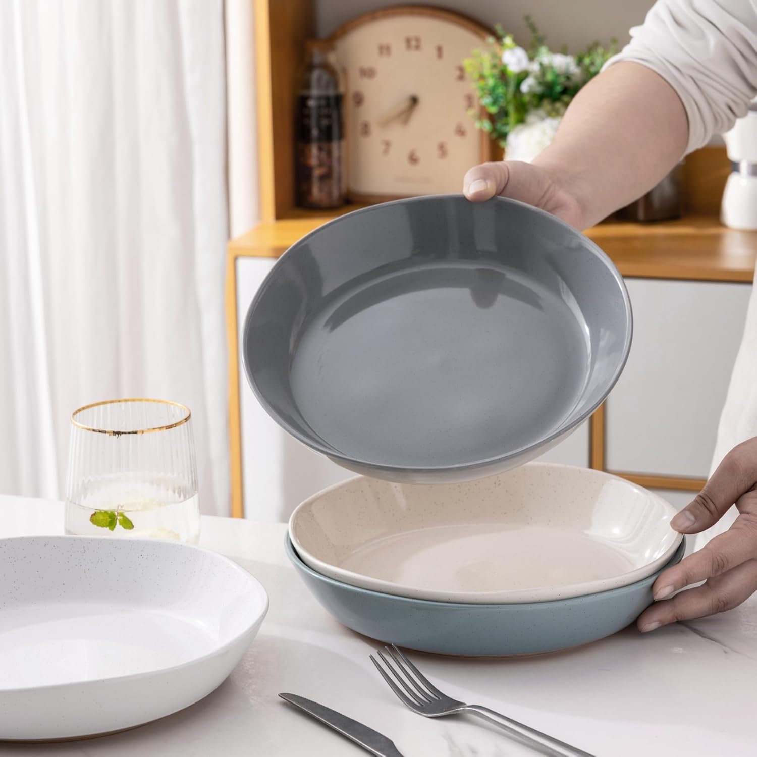 - UNIQUE DESIGN WITH WAVE RIM:These Pasta Bowls are designed by professional artist,The beautiful speckled glaze feels comfortably, It looks fantastic on the table and brightens up your kitchen. It perfect for daily using and special occasion.