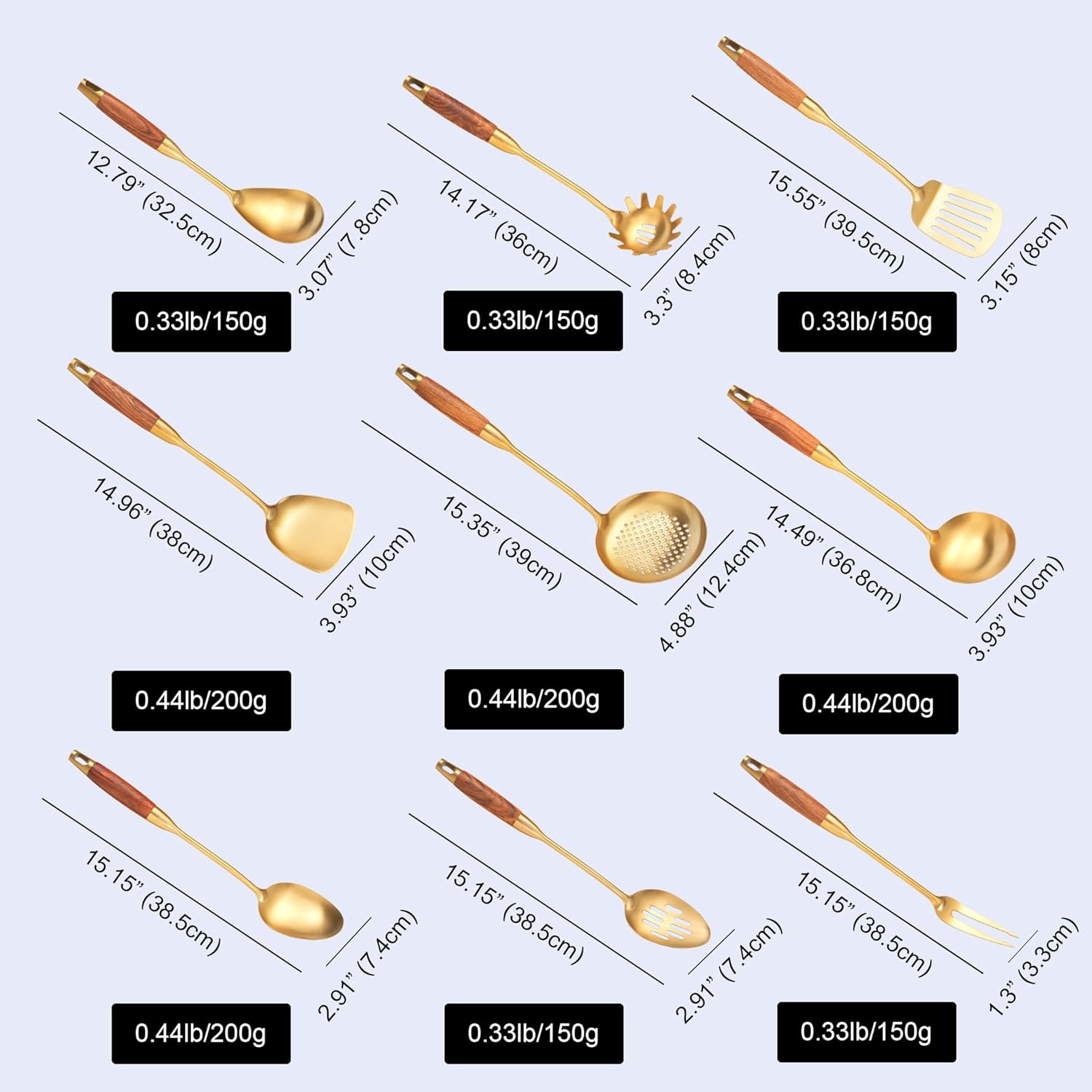 Gold Kitchen Utensils Set, 9 PCS 18/10 Stainless Steel Cooking tools Wood Handle, Solid and Slotted Spoon, Fork, Spatula, Ladle, Skimmer, Slotted Tunner, Spaghetti and Large Spoon