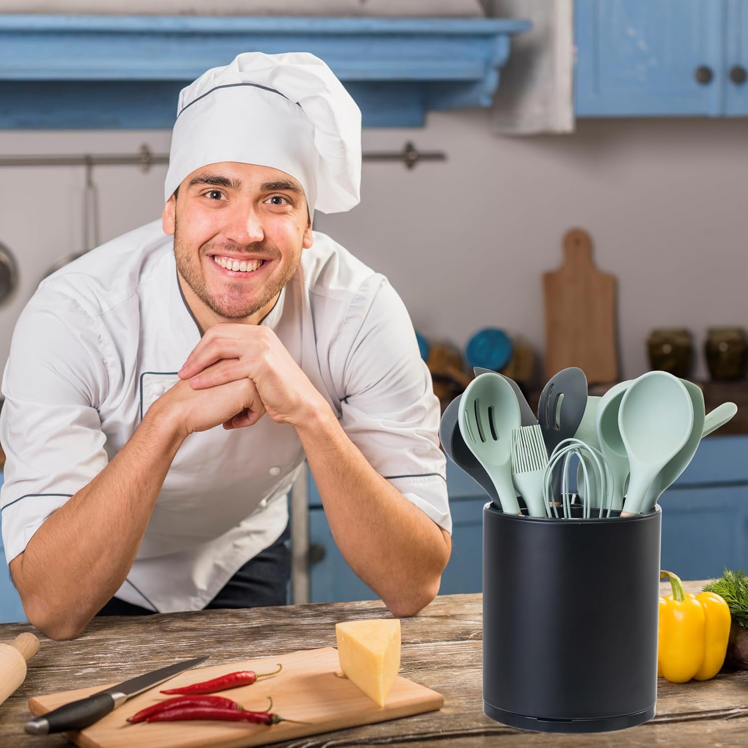 - 360° Rotating Utensil Holder: The 360° utensil caddy with rotating design makes it cooking tools are easy to use and also a great stress relieving companion in the kitchen.The large base of the utensil caddy on the kitchen countertop is equipped with 4 non-slip rubber pieces to secure utensils and prevent scratching the kitchen surface. It provides a simple and efficient storage solution for all your kitchen utensils.