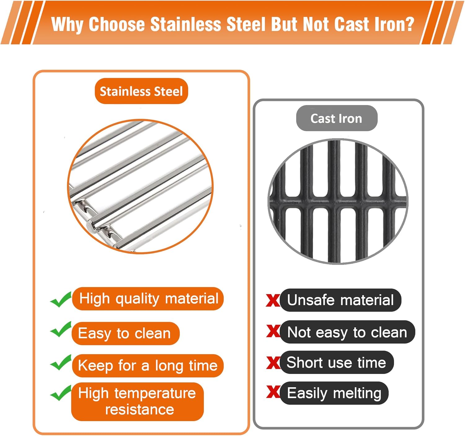 - MATERIAL: The grill grate is made of solid stainless steel and can be used for a long time. It will not peel off or rust as easily as cast iron and enamel bars. It is more durable and easier to clean. The stainless steel grill grate is not only evenly heated, but also evenly spaced grid will leave beautiful grill marks on the food, increasing the barbecue interest