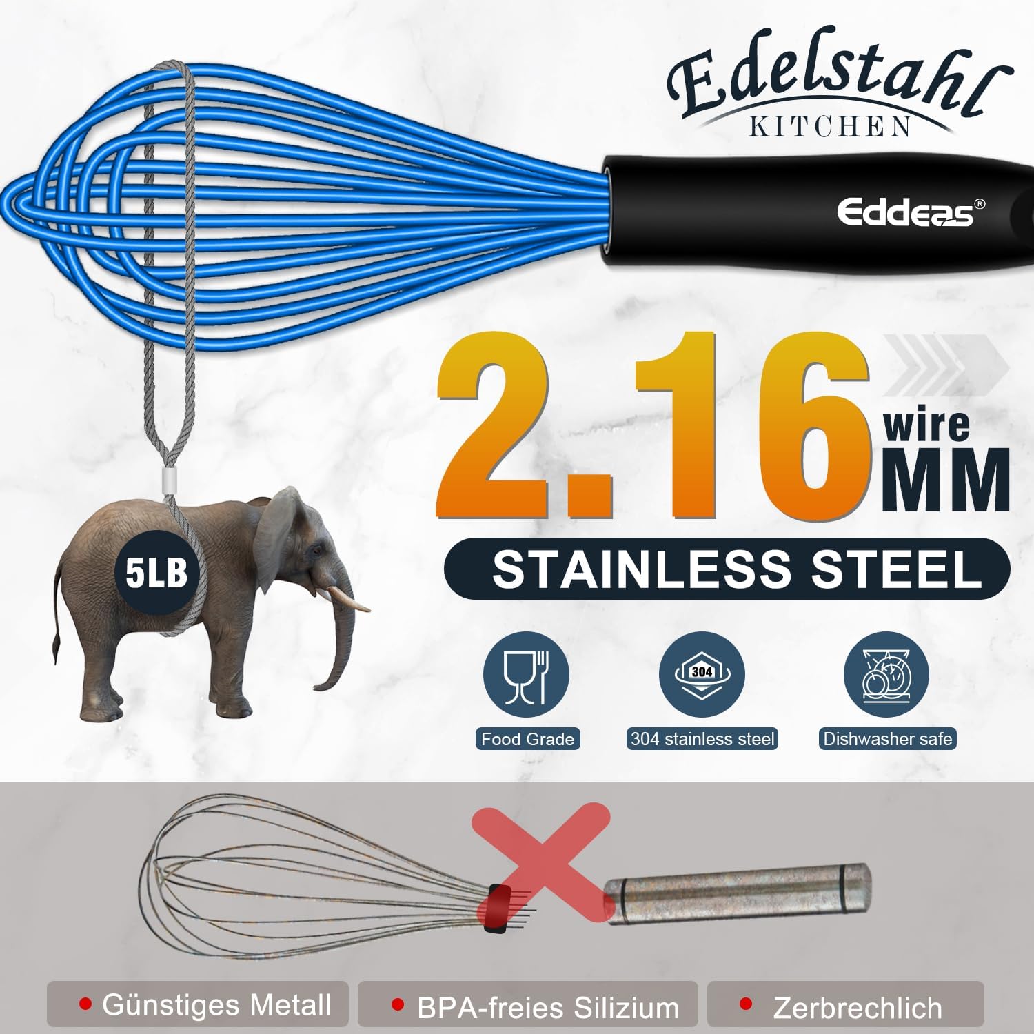 - FOOD GRADE AND BPA FREE-Eddeas Silicone whisk is made of 1.65mm stainless steel wire and 0.3mm professional non-stick silicone, food grade material, BPA free, Won't scratch the surface for your pots and pans.