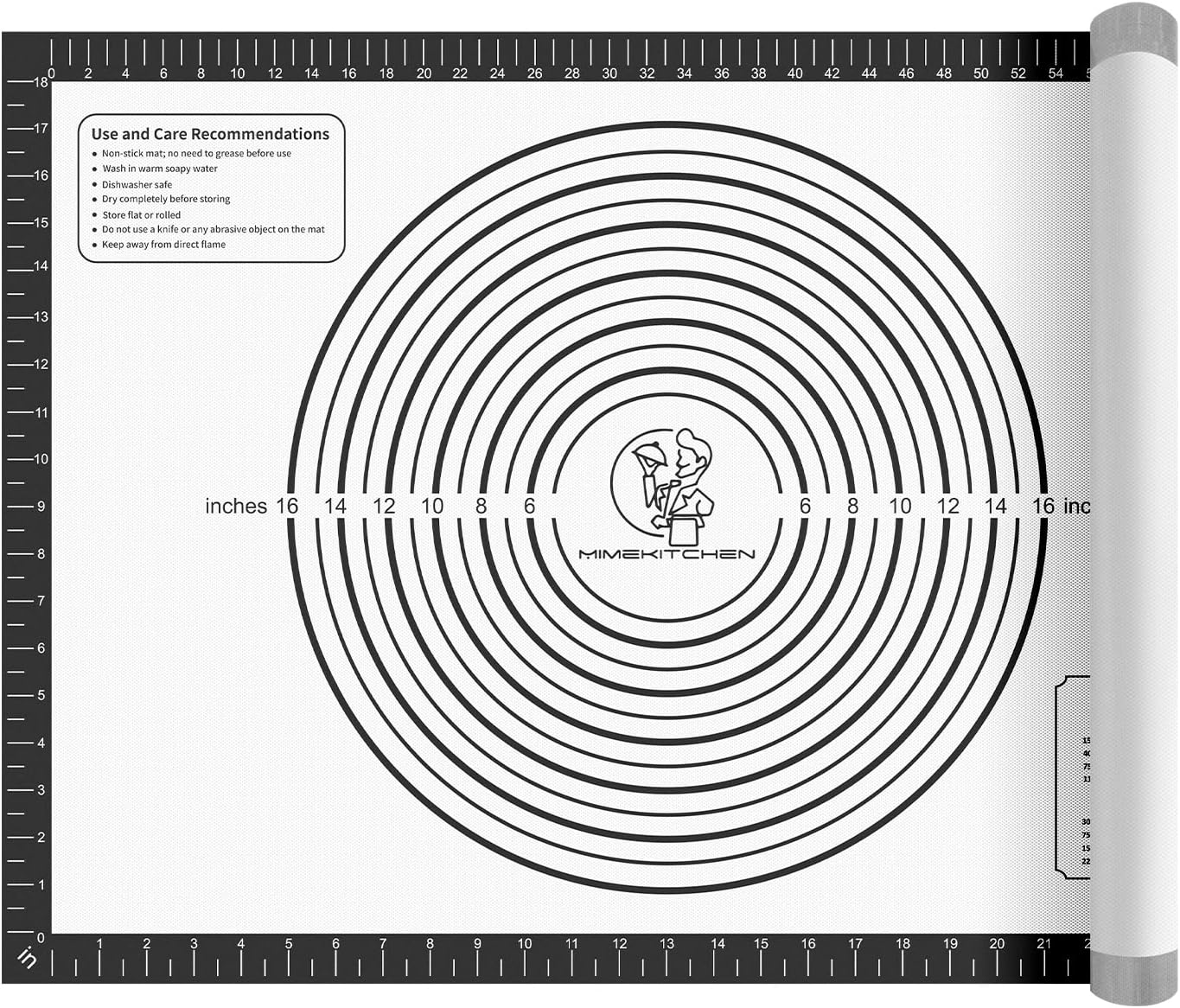 - 【𝐃𝐔𝐑𝐀𝐁𝐋𝐄 𝐒𝐈𝐋𝐈𝐂𝐎𝐍𝐄 𝐁𝐀𝐊𝐈𝐍𝐆 𝐌𝐀𝐓】: Mimekitchen pastry mat consists of multi-layers of silicone and fiberglass to reinforce the mat. It won’t rip or roll up at the edges, and very hard to crinkle or slide around as you roll the dough. It is more durable than regular slim silicone pastry sheet.