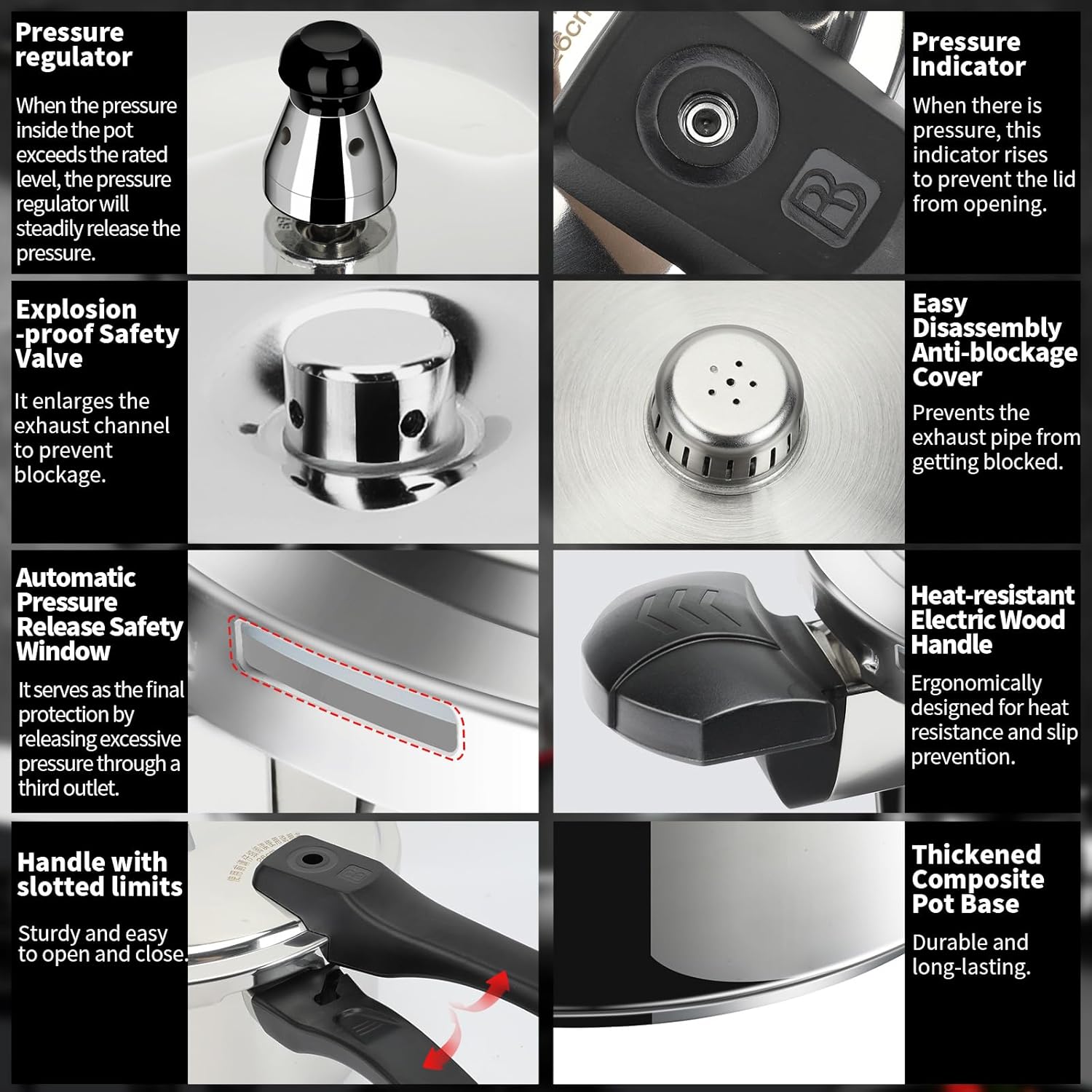 - ✅[Crafted from top-grade stainless steel and durability]-Our Stainless Steel Pressure Cooker guarantees food safety and prevents any harmful reactions with your ingredients. Keep all the nutrients and flavors intact the healthier way! Our pressure cooker boasts quality stainless steel components and ergonomic handles for rust resistance and heat endurance.