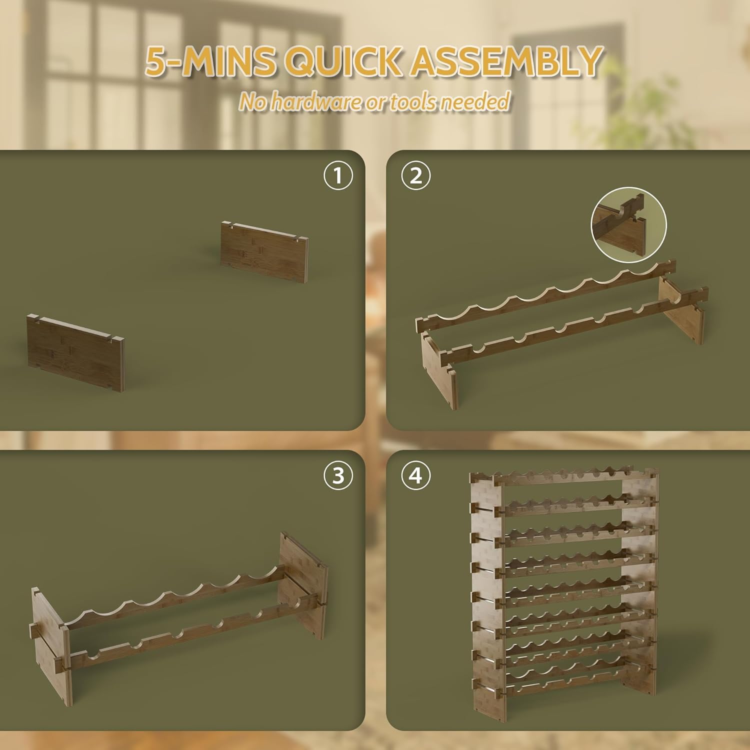 - 𝗘𝗮𝘀𝘆 𝗔𝘀𝘀𝗲𝗺𝗯𝗹𝘆: Each shelf of this modular stackable wine rack features deep grooves and the partitions are tightly fastened to each other without loosening; No tools required, Simple follow the assembly instructions to combine the partitions in order, and you'll have an elegant wooden wine rack in about 5 minutes (Please make sure whether the parts are positioned correctly before assembly); If you need to move the wine rack, please be sure to remove the wine bottles first