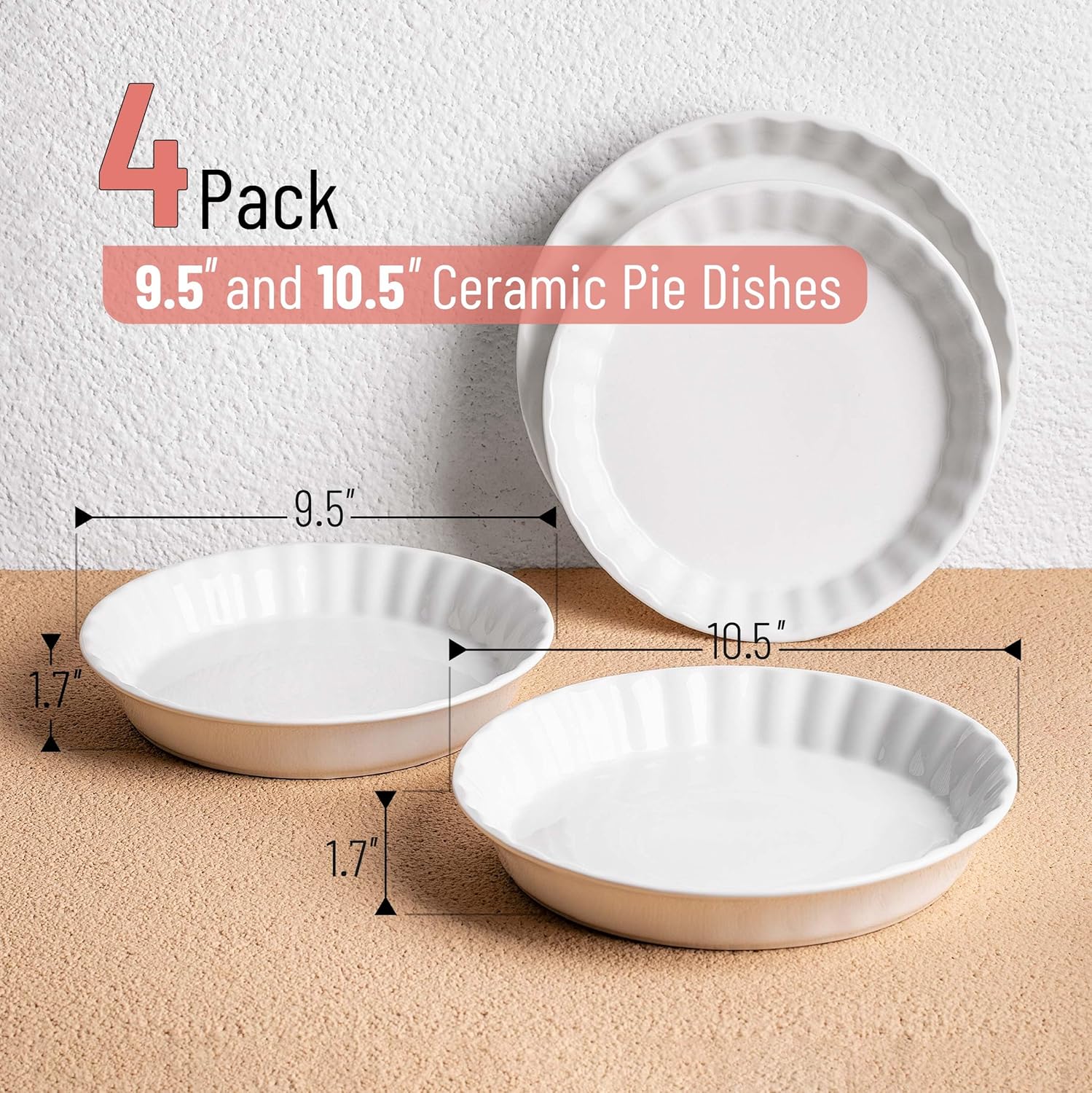 - BTaT ceramic pie dish set includes four dishes, with two 10.5-inch and two 9.5-inch dishes, perfect for preparing and serving a variety of pies, tarts, and casseroles.