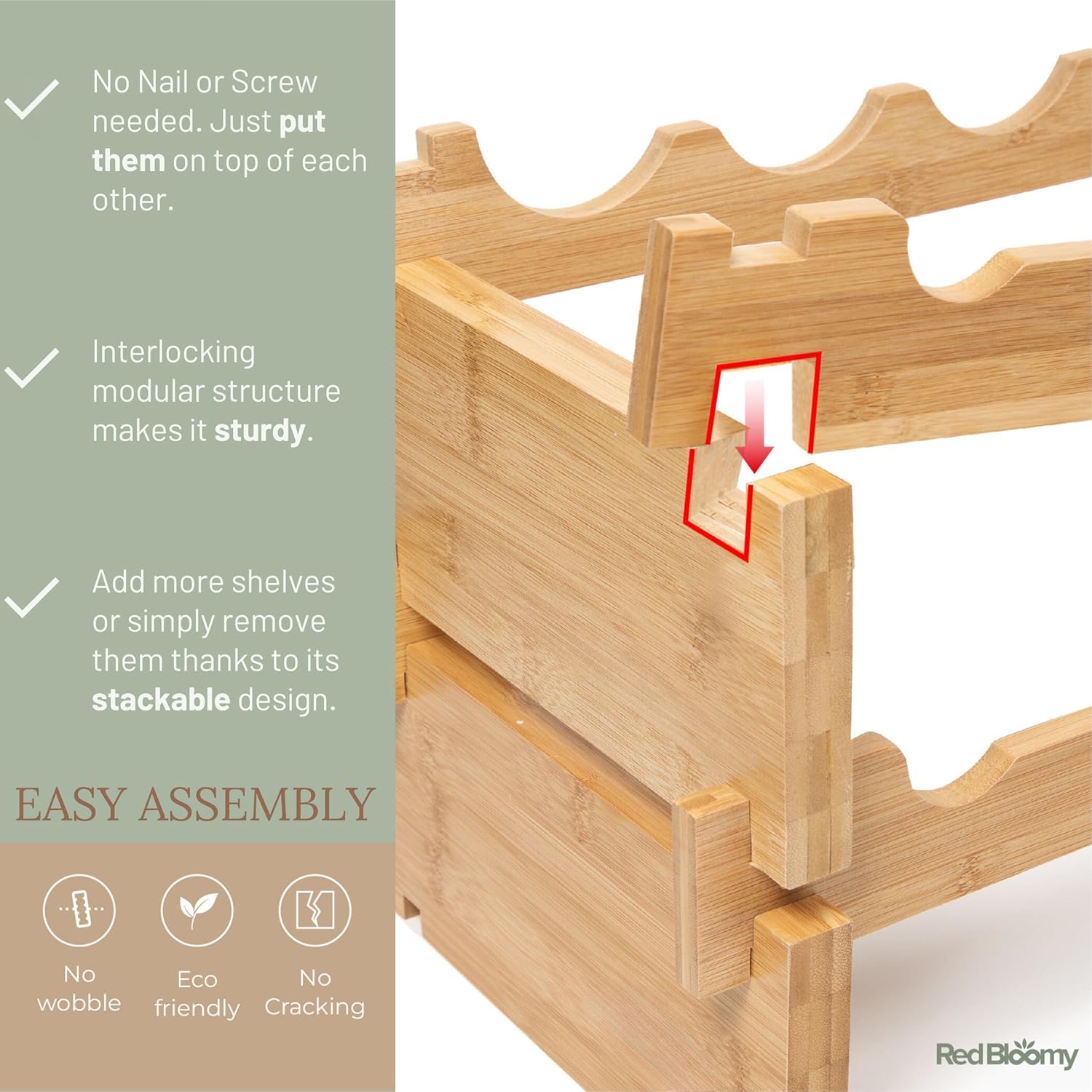 - Space-Saving 8-Tier Design: Embrace the SereneLife stackable bamboo wine rack's innovative 8-tier stackable design. The layered structure with notches and slots ensures a sturdy and wobble-free display, whether placed on a wood floor or carpet.